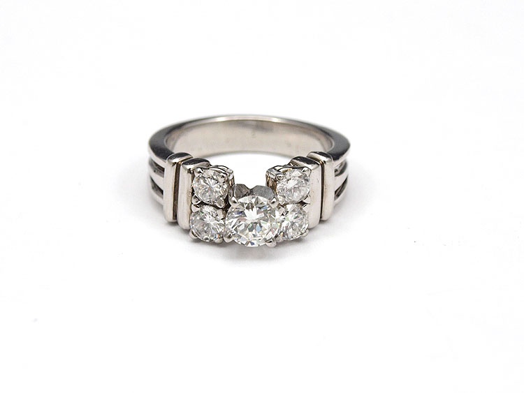 PLATINUM 1.00 CTW DIAMOND RING: Platinum ring contains five round brilliant cut diamonds, the primary diamond approx. .50 Ct.. The approx. total weight being 1.00 Ct. The diamonds average VS in clarity and H-I in color. The diamonds are prong set. Weight: 10.0 grams. Size: 5