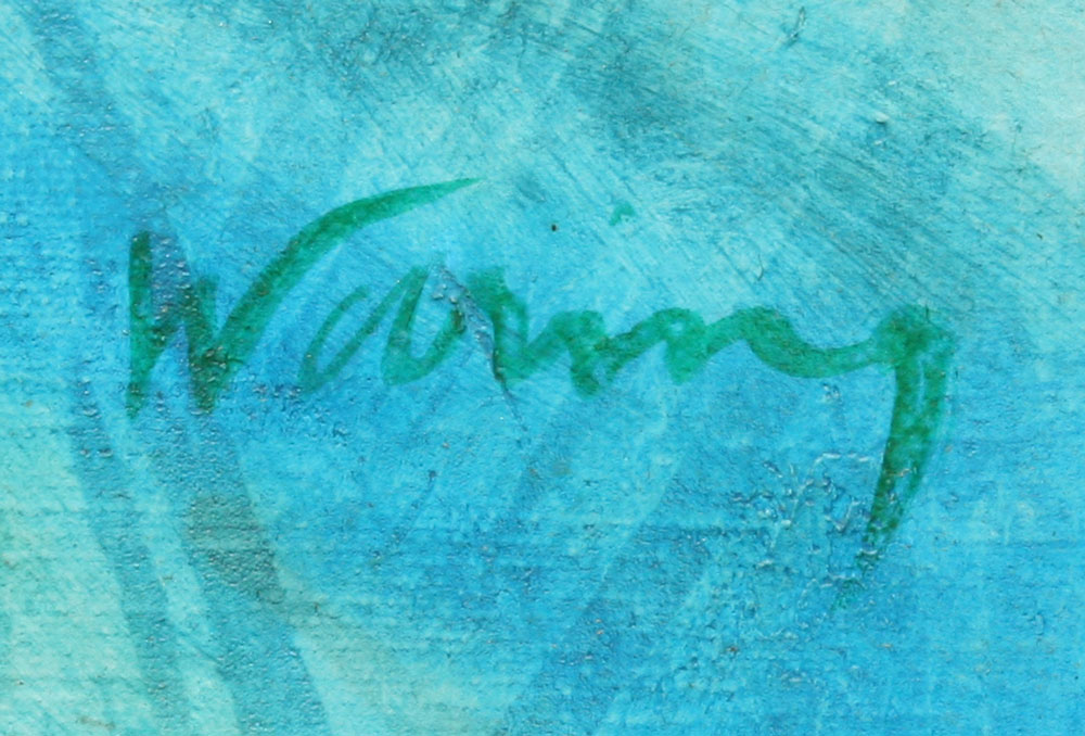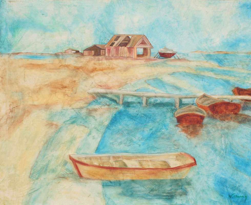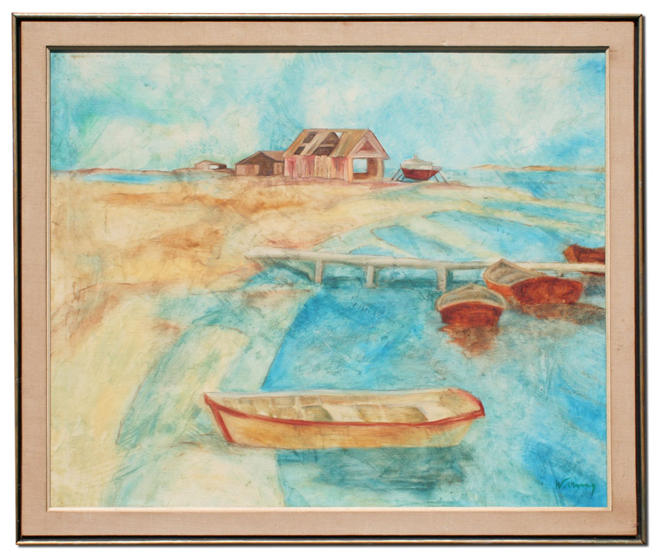MODERNIST SHORELINE OIL/CANVAS WITH BOATS: Illegibly signed Waring?, 30'' x 36'', framed 44'' x 41''.