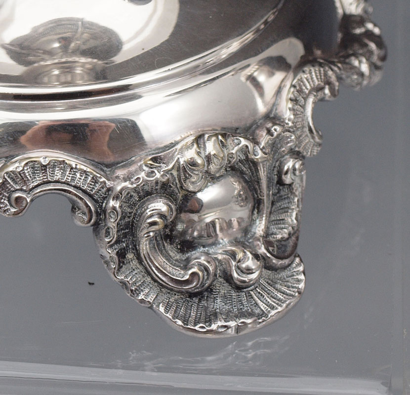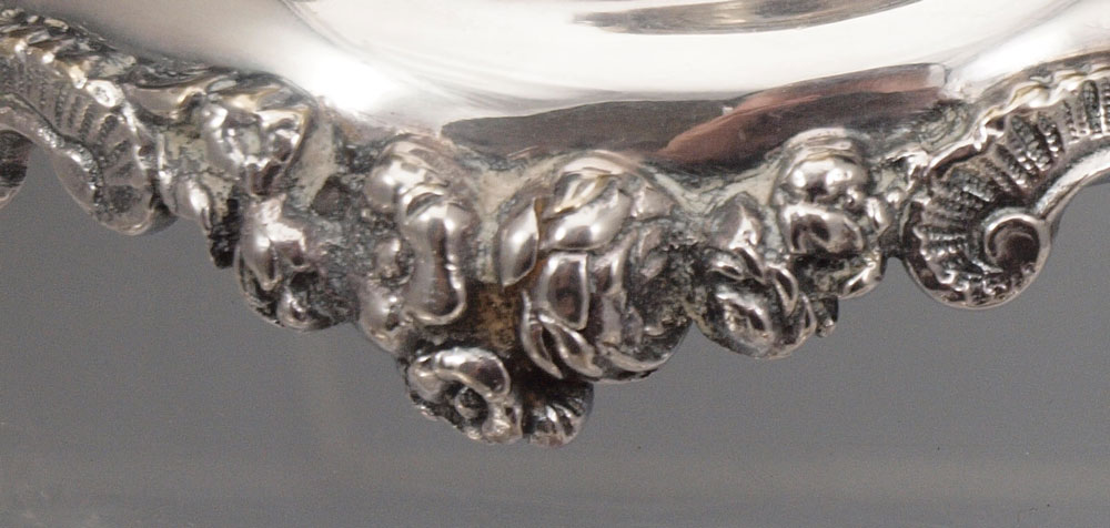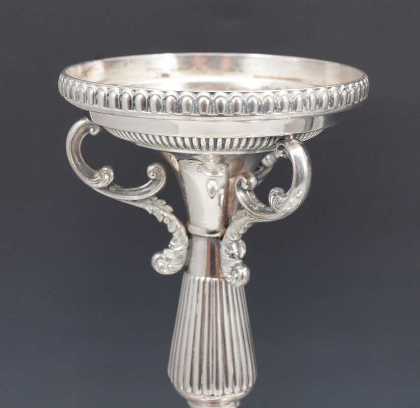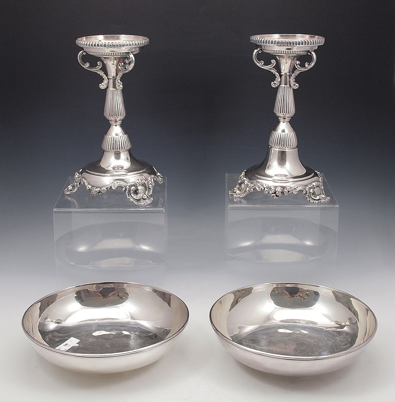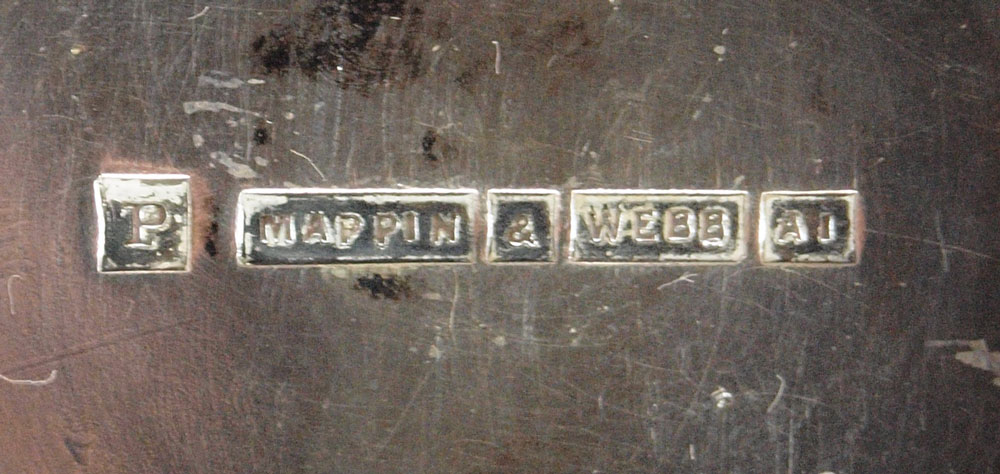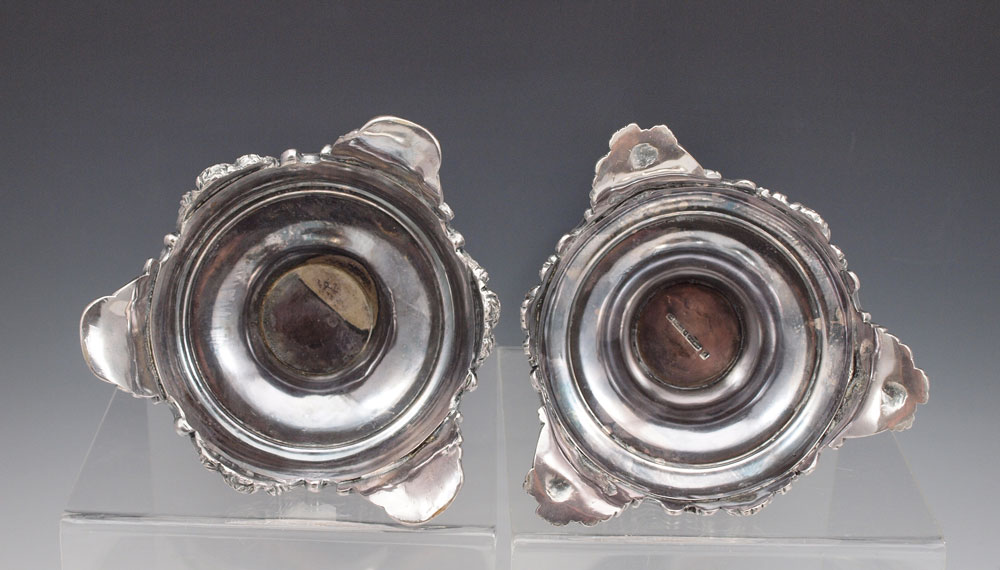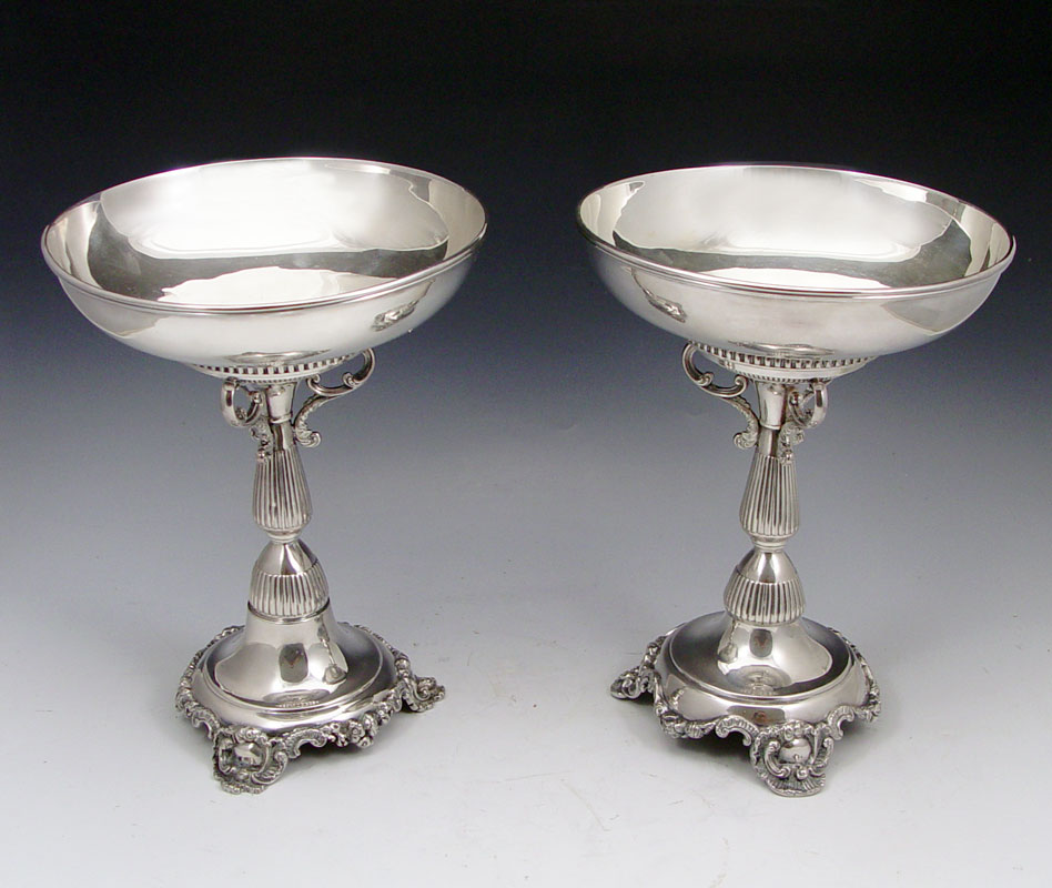 PAIR MAPPIN & WEBB SILVERPLATE PEDESTAL COMPOTES: Base measures 8 3/4'' h. x 5 3/4'' base dia. Bowls, monogrammed P underneath measure 2 1/4'' h. x 8 1/4''
