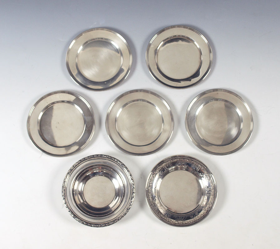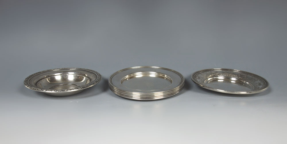 ESTATE COLLECTION OF STERLING PLATES: To include 5 M. Fred Hirsch Co. bread plates (6'' dia.), embossed International Sterling bread plate (6 1/8''), reticulated rim Wallace low bowl, (6 1/8''). Approx. 17.1 troy oz.