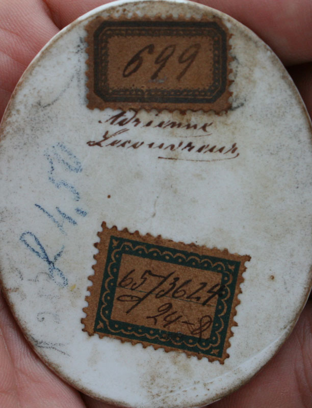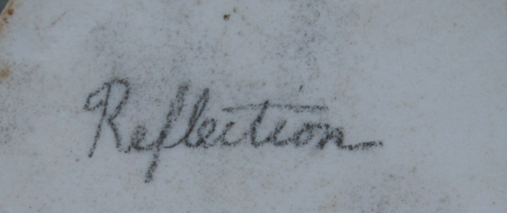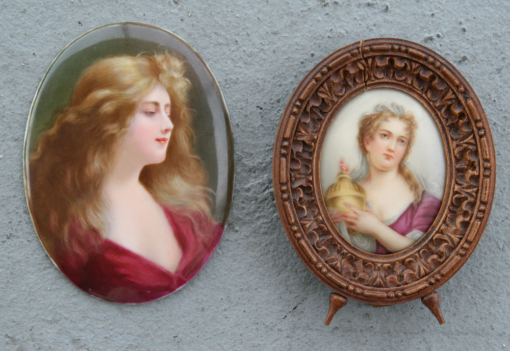 PAIR MINIATURE PAINTINGS ON PORCELAIN TO INCLUDE: ''Reflection,'' Oval, unframed of a young maiden provocatively posed, Hutschenreuther mark verso ''Adriene Licou?''. Several stamps and title verso, 3 1/2'' x 2'', encased in carved wooden frame with stand showing wear, 4 1/4'' x 3''.