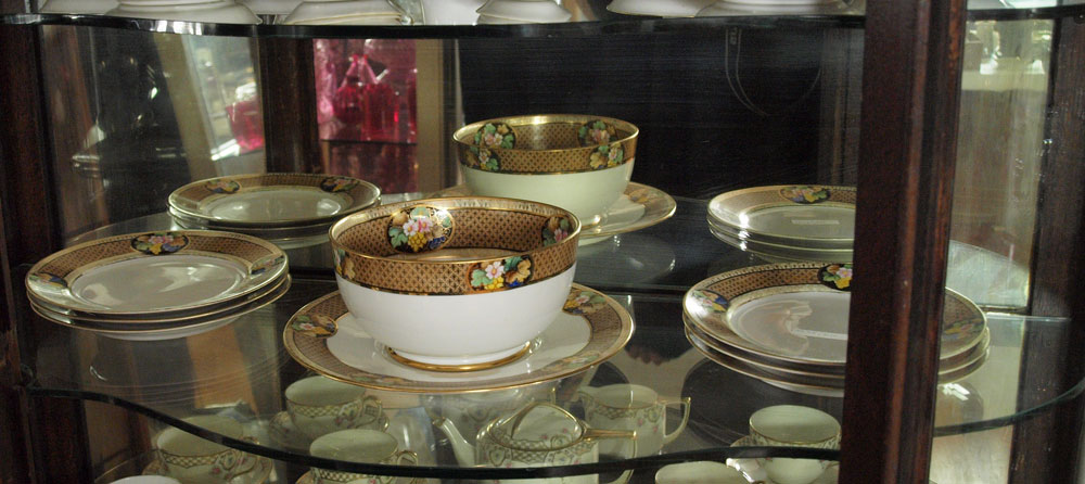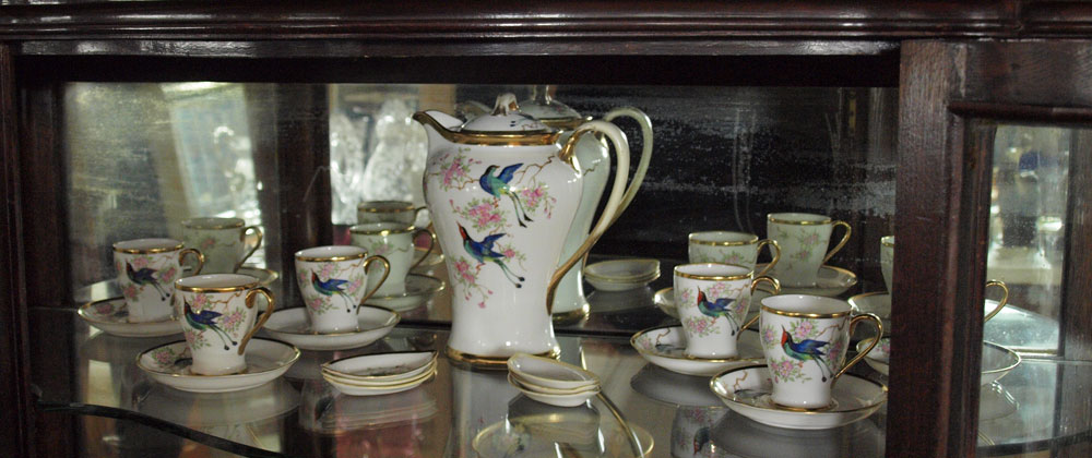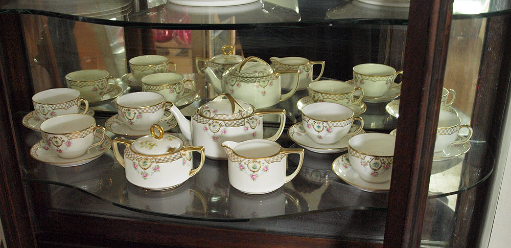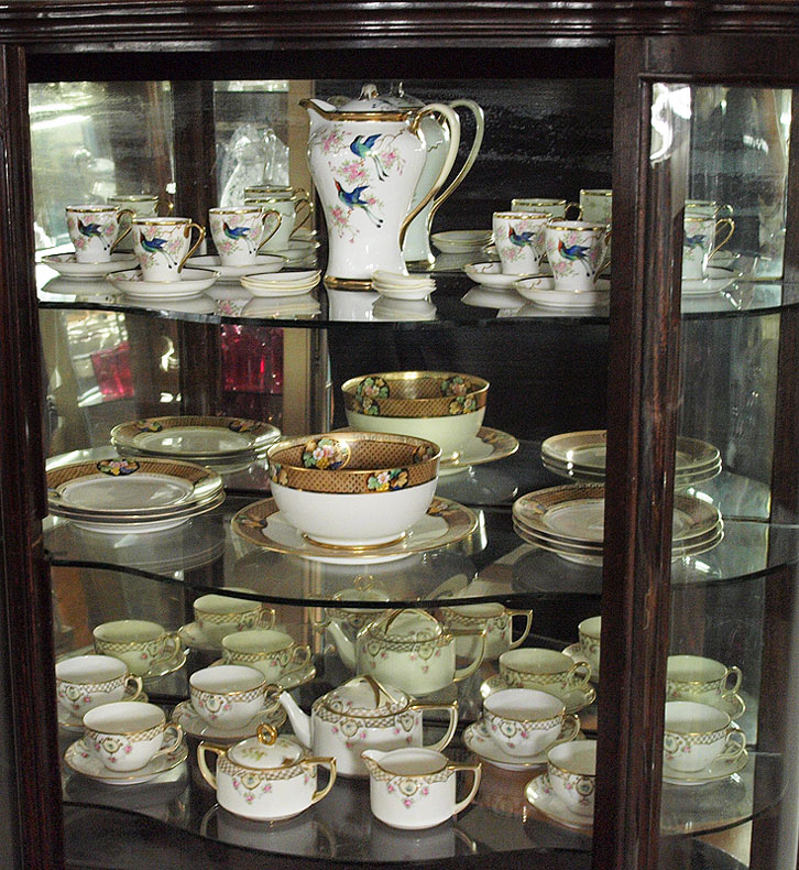 3 GROUPS OF HAND PAINTED NIPPON CHINA: 1) Bird design coffee pot with 6 cups and saucers. 2) Serving bowl with underplate and 6 individual plates. 3) Delicate rose decorated teapot with creamer and sugars, 6 cups and saucers.