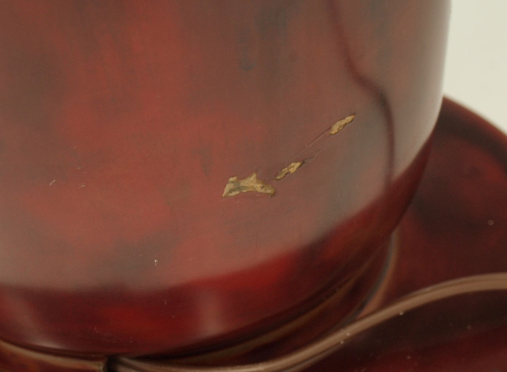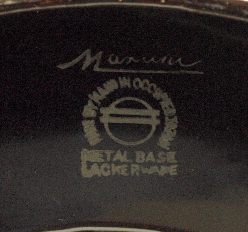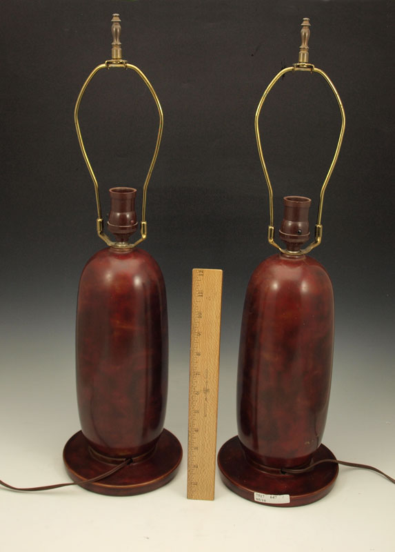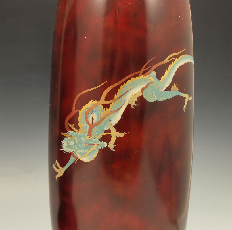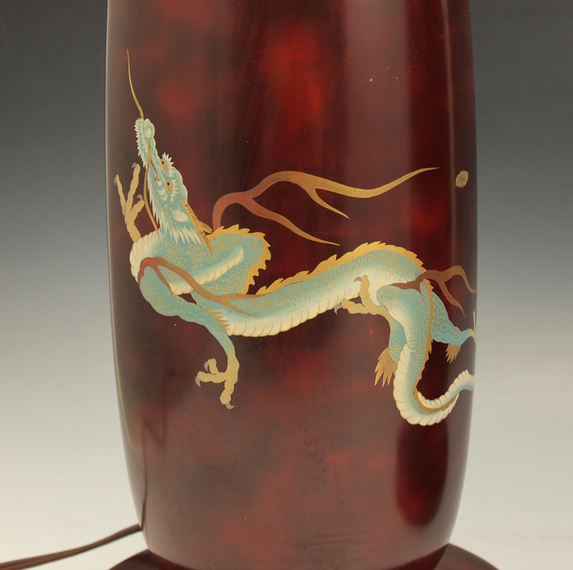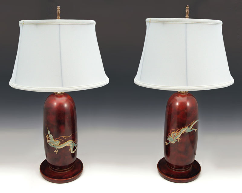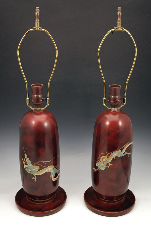 PAIR MARUNI OCCUPIED JAPAN LACQUER WARE LAMPS: Hand painted dragon design, 23'' tall overall.