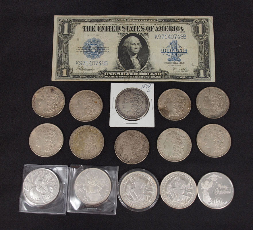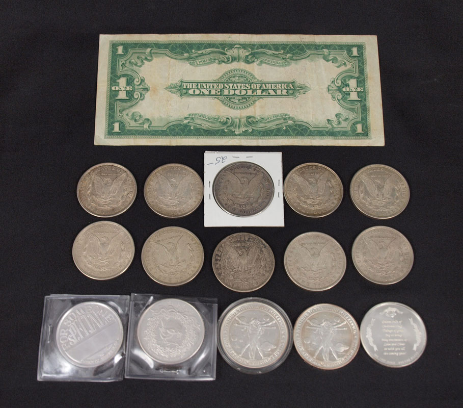 10 MORGAN DOLLARS WITH 1923 $1 SILVER CERTIFICATE: To include 1878 S, 1880, 1904, 7 1921. 1923 large $1 silver certificate. Also included with lot is 5 .999 fine silver commemorative medallions, 1 troy oz. each. Ungraded.