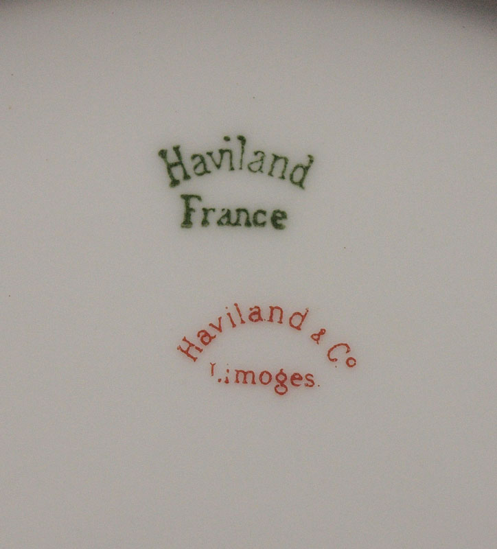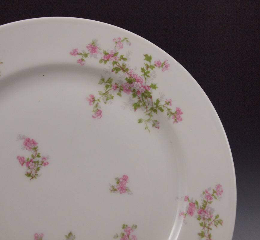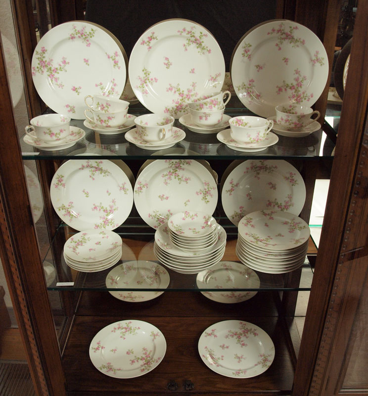 FRENCH HAVILAND LIMOGES CHINA CA. 1904-1924: Delicate pink flowers. 48 piece partial service to include 8 dinner plates, 9 salad plates, 6 soup bowls, 5 bread plates, 6 dessert bowls, 8 cups and 6 saucers.