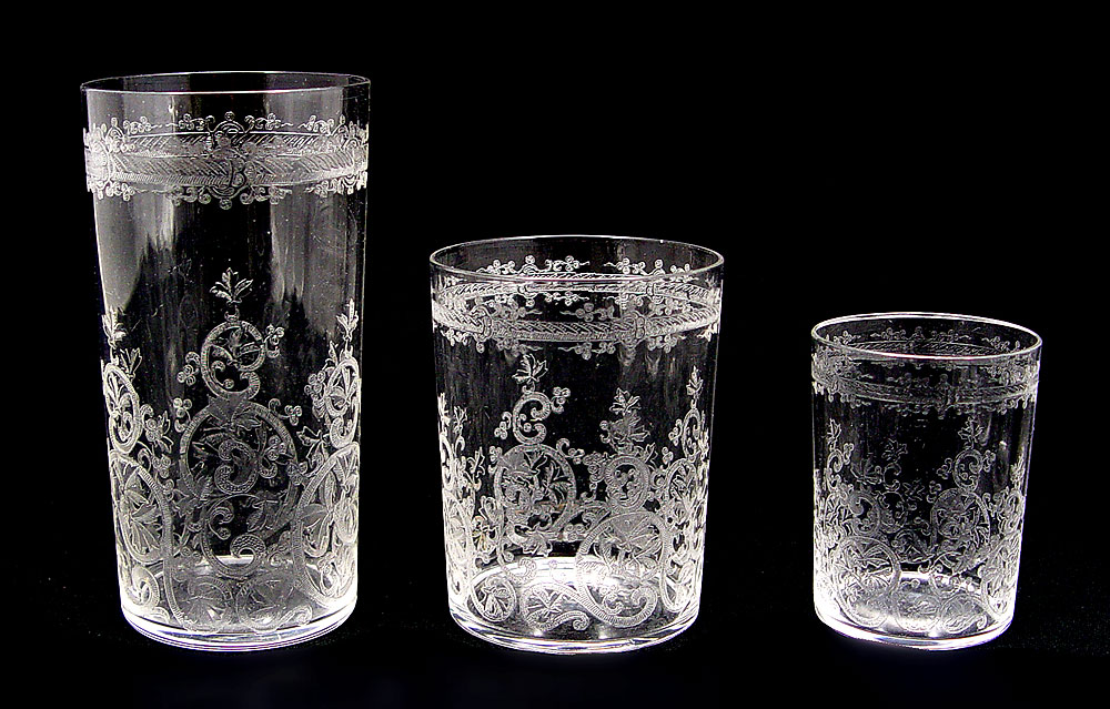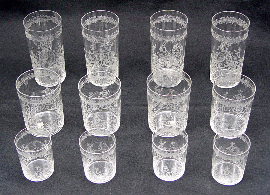 FRENCH BACCARAT ETCHED CRYSTAL TUMBLERS: 4 each of three sizes - 5 1/16'', 3 3/4'' & 2 3/4''. Paper dot labels to bottom of two.
