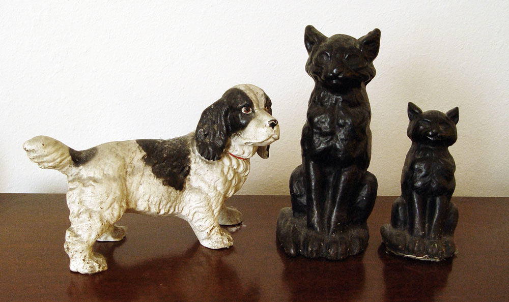 3 CAST IRON DOOR STOPS DOG & 2 CATS: To include 1) Cast iron Cocker Spaniel dog. 7'' h. x 11'' x 4''. 2) Black cat, 9 1/2'' h. x 4 1/2'' x 3 3/4''. 3) Smaller black cat, 6 3/4'' x 3 1/2'' x 2 1/4. All unmarked.