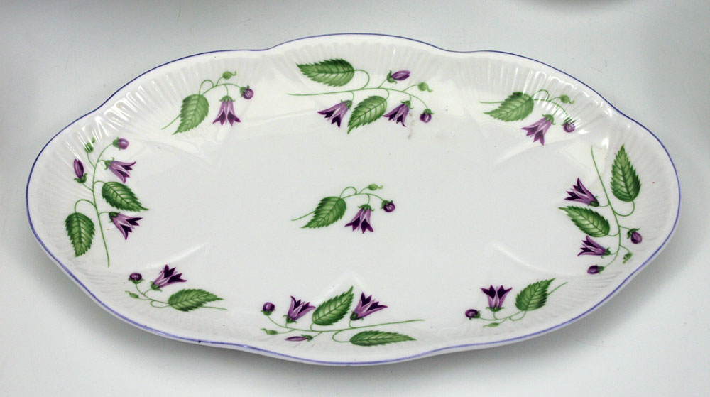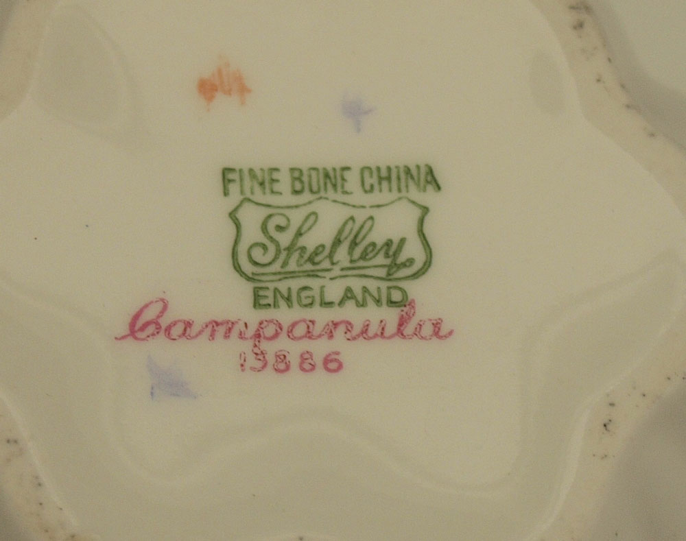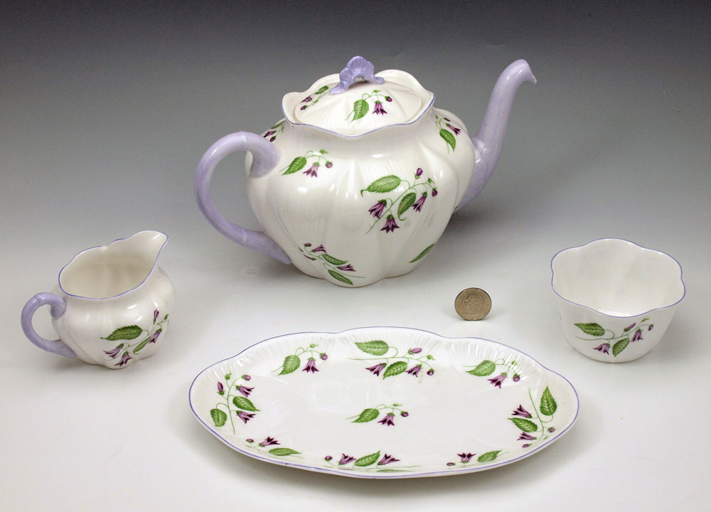 SHELLEY CAMPANOLA CHINA TEA SET: Delicate purple flowers on crisp white. Teapot, creamer, sugar and tray.