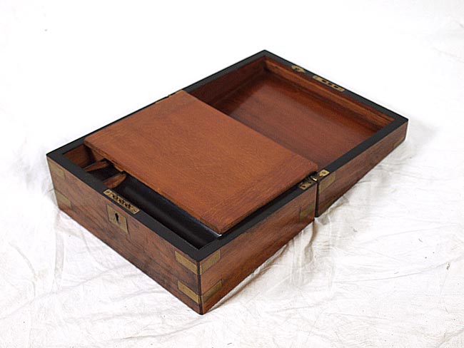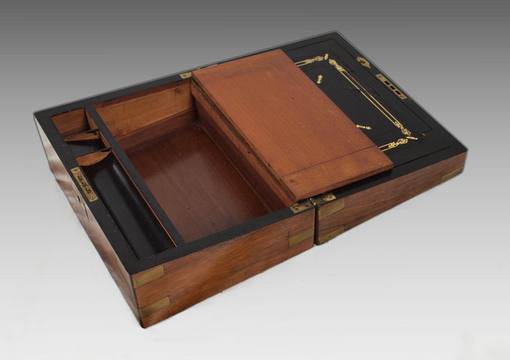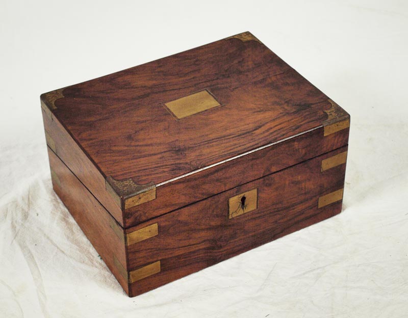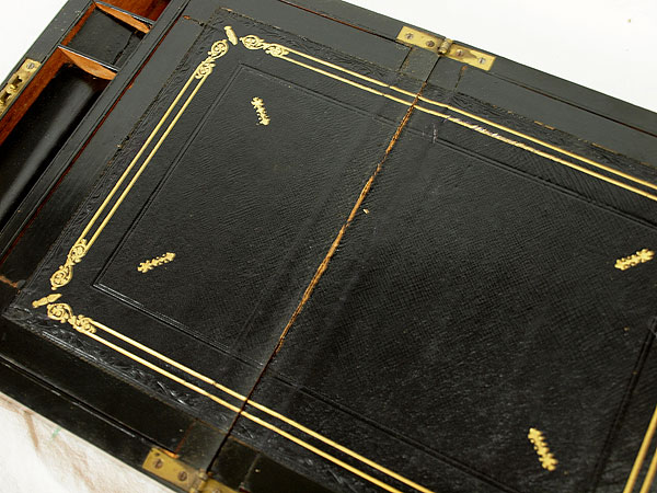 ENGLISH LAP DESK: Burl wood veneer with brass ornimentation. Black leather top interior. 6'' h. x 11 3/4'' x 9''.