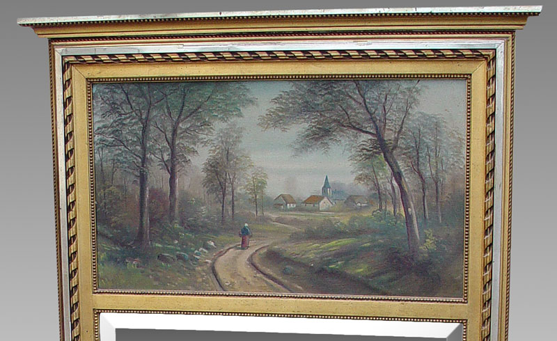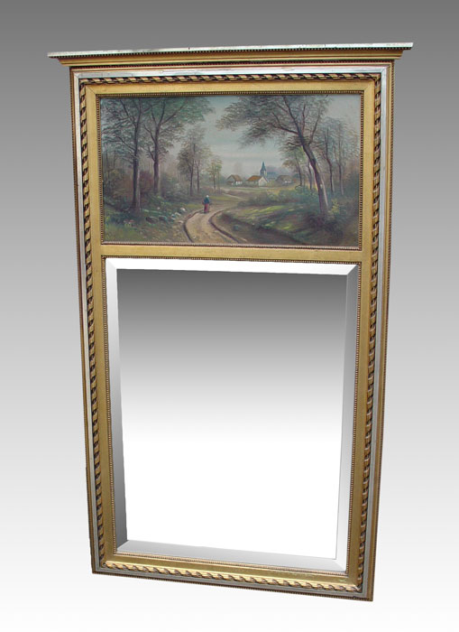 LARGE FRENCH TRUMEAU MIRROR: Beveled looking glass under a hand painted panel depicting a village path. 62'' h x 40'' x 2''