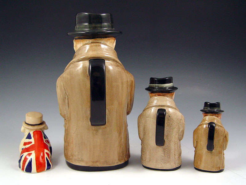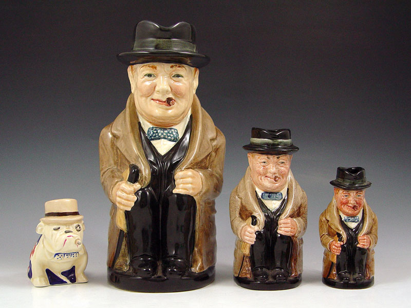LOT OF ROYAL DOULTON CHURCHILL TOBY JUGS AND BULLDOG: Three Winston Churchill toby jugs measuring approx. 9'', 5 1/4'' and 4''. Bulldog in Union Jack with derby hat and cigar, crazing, 3''h. Sold as a lot.