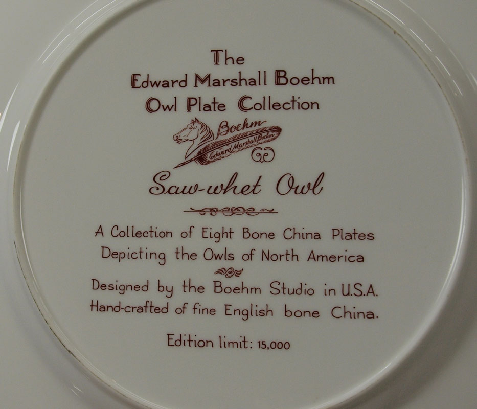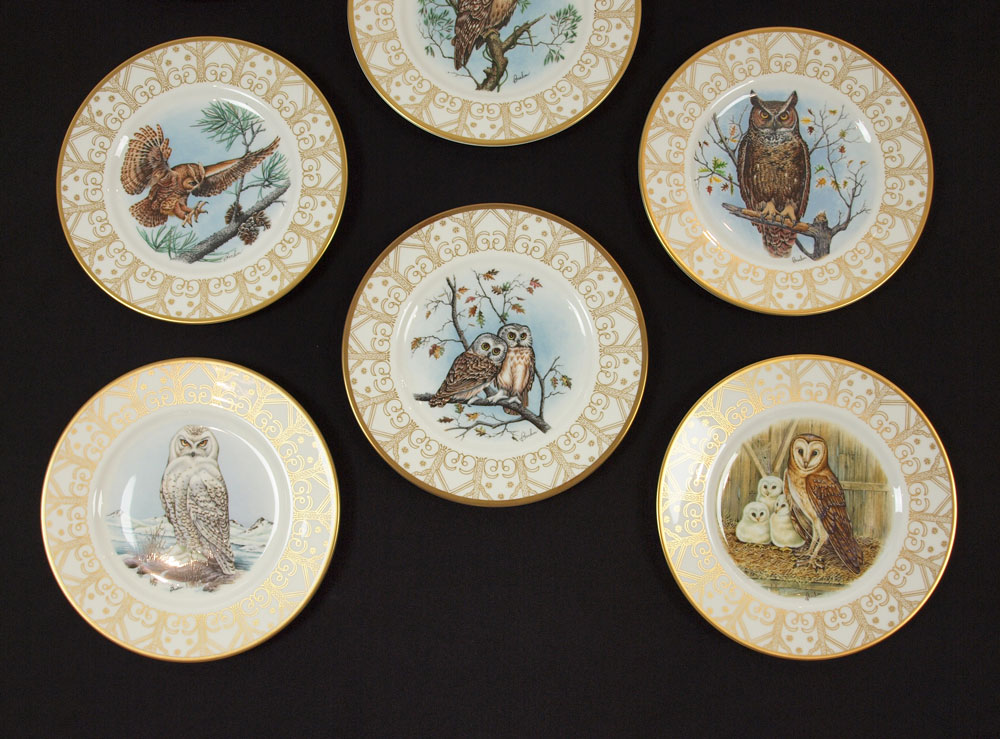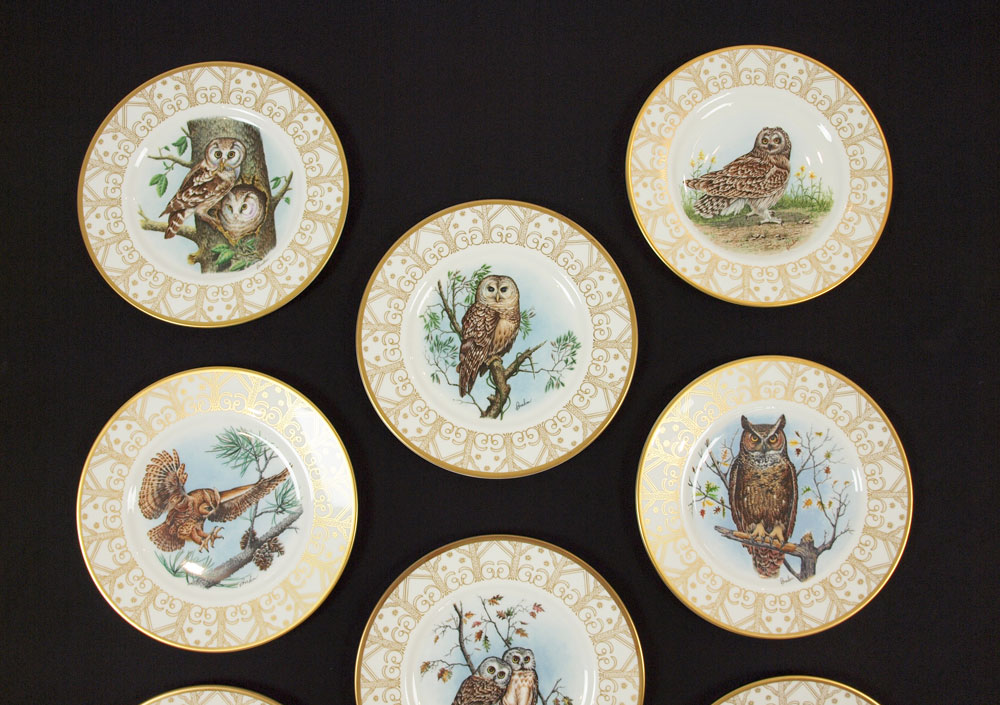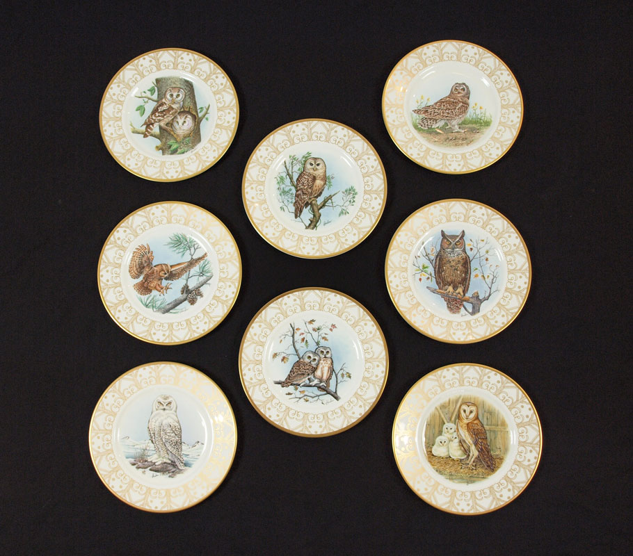 EDWARD MARSHALL BOEHM PORCELAIN OWL PLATES: 8 china plates depicting Owls of North America, 10 3/4'' dia. Limited edition of 15,000.