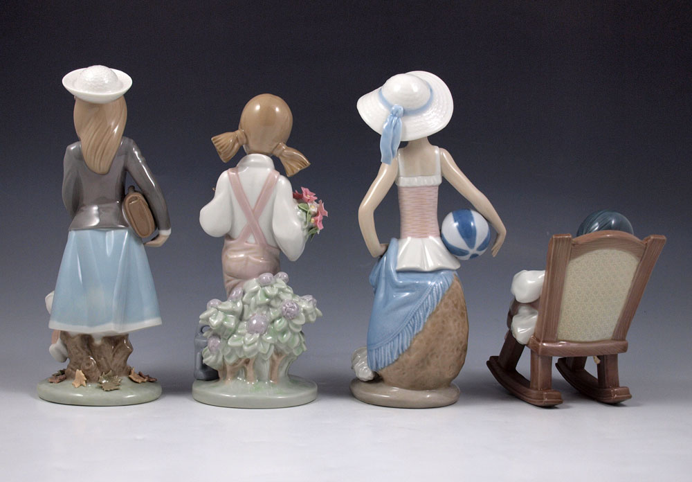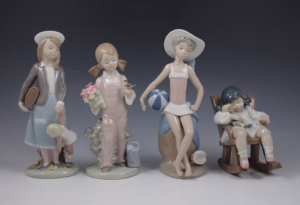4 LLADRO PORCELAIN LITTLE GIRL FIGURINES: 1)''Autumn'', Spanish name ''Otono Infantil'', #5218, glaze finish, issued 1984, retired 1999, parts of leaves missing from two in back and stem from one in front, approx. 8''h.; 2)''Spring'', Spanish name ''Primavera Infantil'', #5217, glaze finish, issued 1984, active, at least two flower petals missing, approx. 7 1/2''; 3)''Summer'', Spanish name ''Verano Infantil'', #5219, glaze finish, issued 1984, retired 1999, approx. 8''h.; and 4)''Naptime'', Spanish name ''Dormidita en la Mecedora'', #4558, issued 1987, retired 2004, approx. 4 3/4''h. Sold as a lot.
