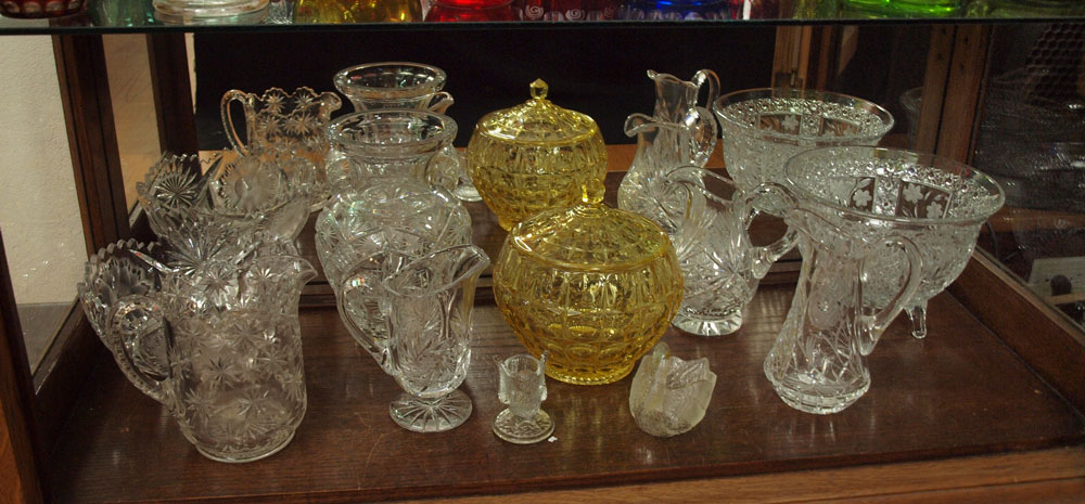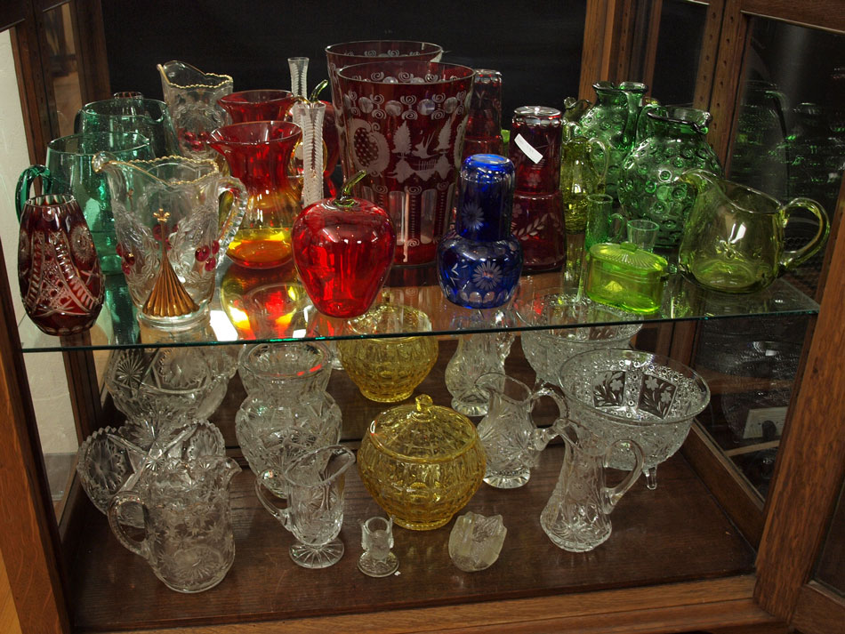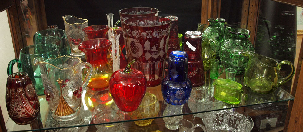 25 PIECE MEGA LOT OF COLORED AND CRYSTAL GLASSWARE: Victorian to modern to include Northwood cherry pitcher. Cobalt and ruby cut to clear tumble ups, large glass apple, cut ad pressed crystal vases and pitchers, toothpick holders. The tallest is the Bohemian ruby cut to clear vase, 10''. The smallest is the 3'' owl toothpick holder. Everything on the two shelves.