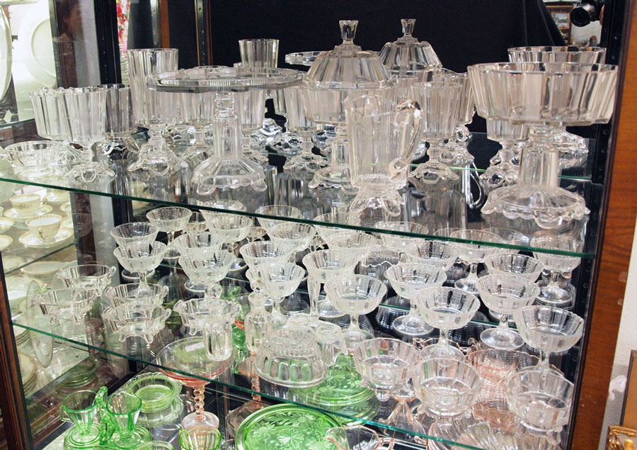 LARGE COLLECTION OF CLEAR EARLY AMERICAN PATTERN GLASS: Cake stand 7 5/8''h.x 10''dia., pedestal compote 8 3/8''h. x 8''dia., set of 12 sherbet dishes 4 1/2''h., covered pedestal candy dish 11''h., goblets 7 at 6 1/2''h. and 1 at 6 5/8''h., salt and pepper caddy no shakers, open sugar and creamer, 3 small round bowls 2 3/4''h., 5 small oval bowls 2 1/4'' h. x 5 1/4'' x 3 1/4'', 2 cruets, 9'' vase?, two different 5 3/4''h. vases?, and a Rope and Anchor motif butter mold. Approx. 40 pieces, sold as a lot.