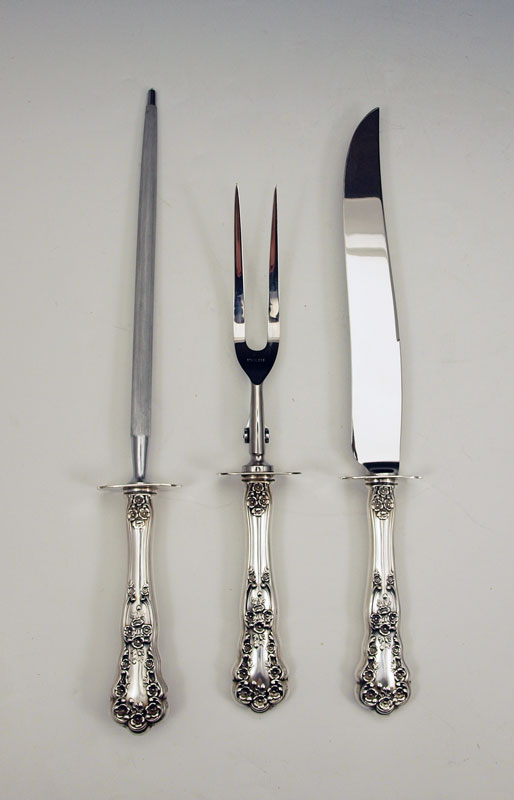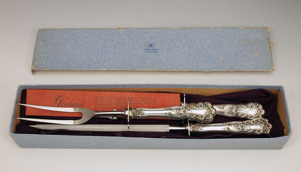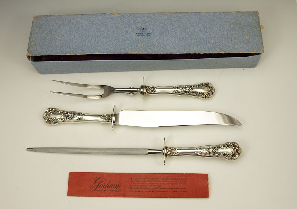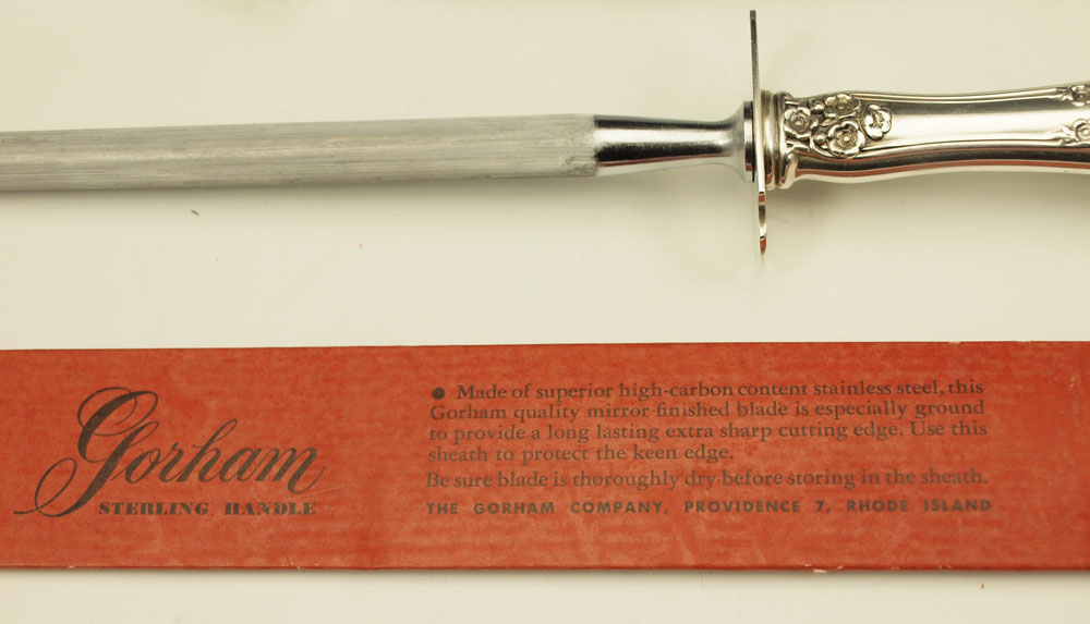 GORHAM STERLING HANDLE CARVING SET: Set appears to never have been used. Sterling handles with stainless blades & tines. Fork 10 7/8'', knife with original blade cardboard 13 1/2'', sharpener 14''. Sold with original box from Ogden & Schlick, New Haven Conn.
