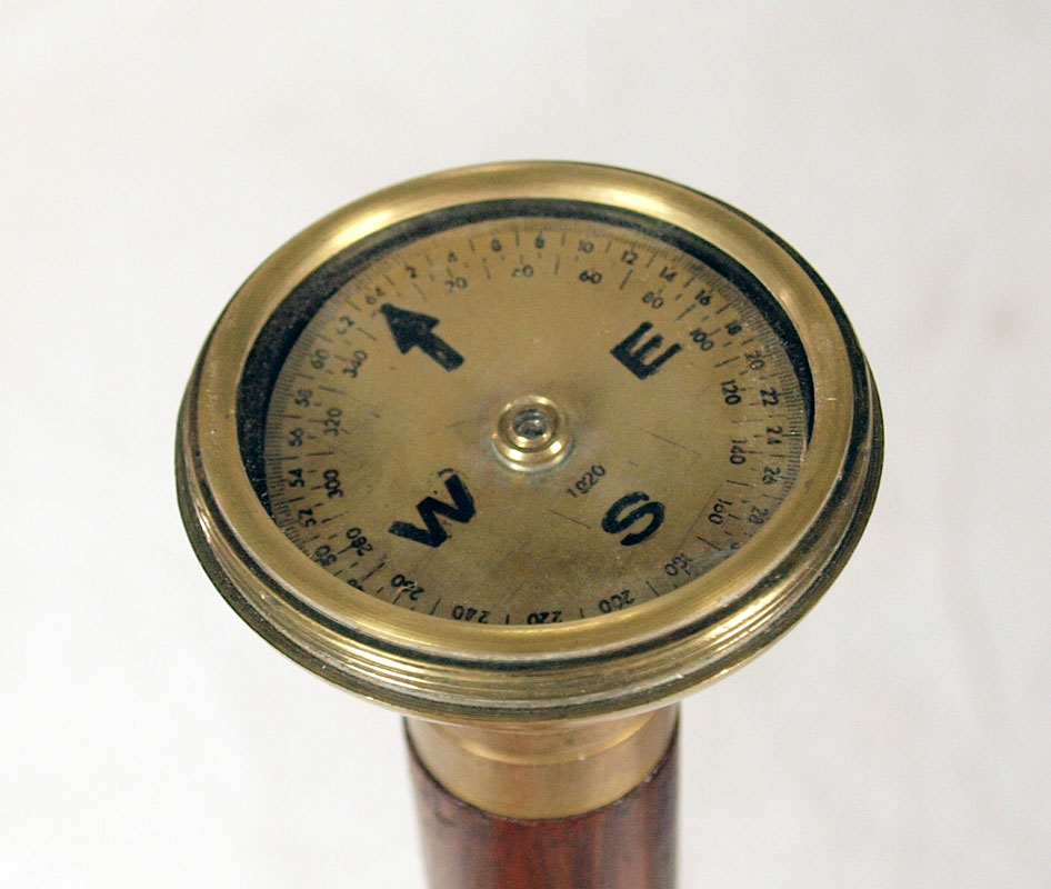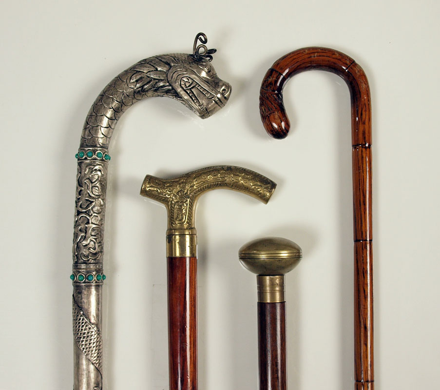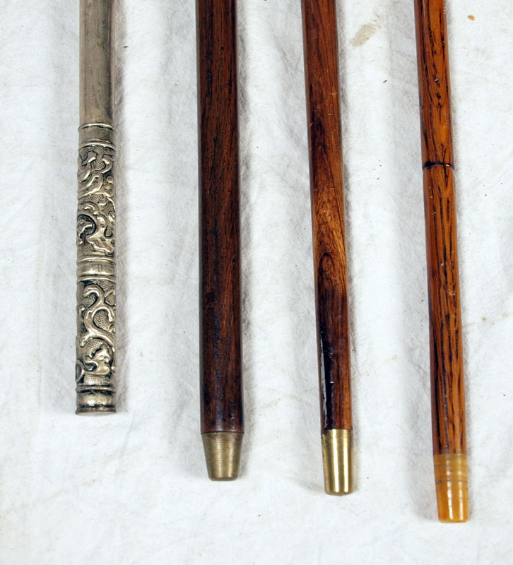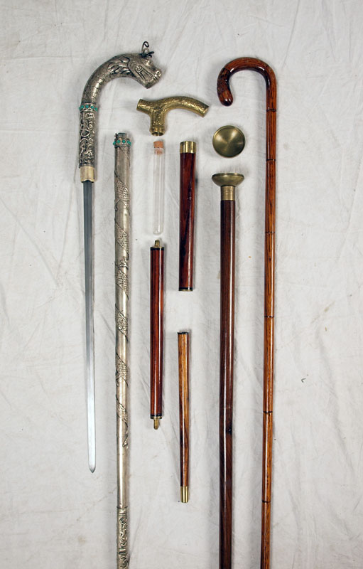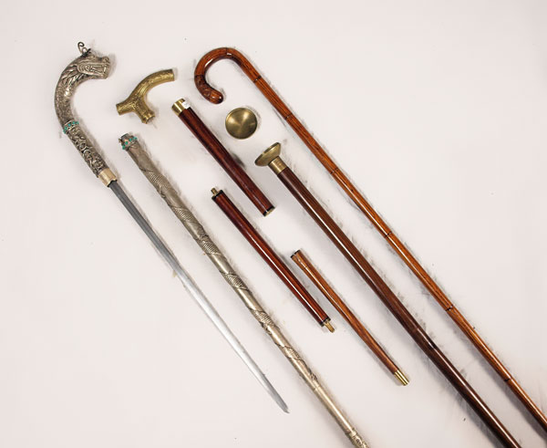 COLLECTION OF 4 DECORATIVE WALKING STICKS: To include 1) Brass topped with compass under screw off dome, mahogany shaft with brass tip. 36 1/2'' l. 2) Silver toned metal dragon head sword cane with blue turquoise colored stones, decorated metal with swirl dragon skin pattern. 37 3/4'' 3) Chestnut cane with carved handle, rubber tip. 36 1/2'' 4) Smugglers cane with 3 sections, decorated brass handle that unscrews to reveal vial. 3 sections unscrew to become a travel cane, brass tip. 34 1/4''.