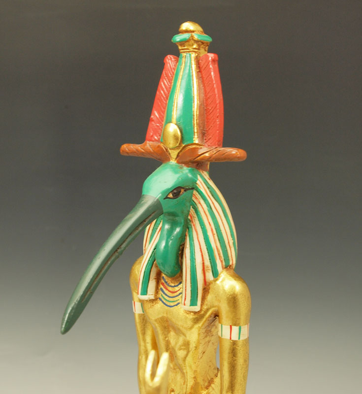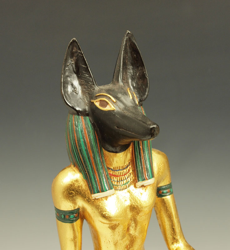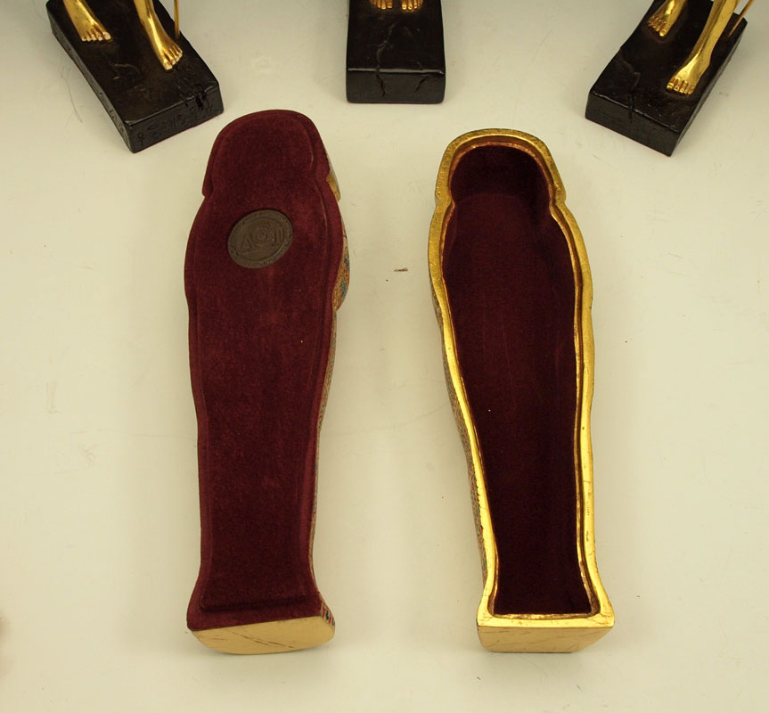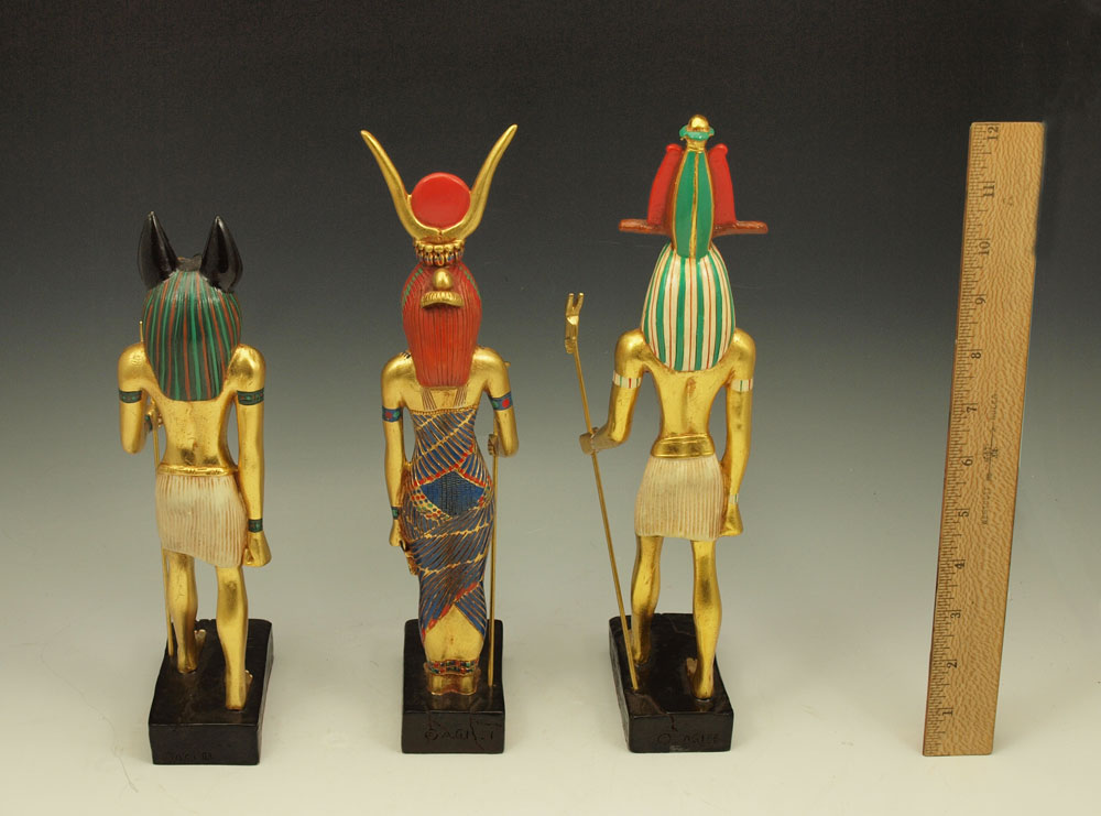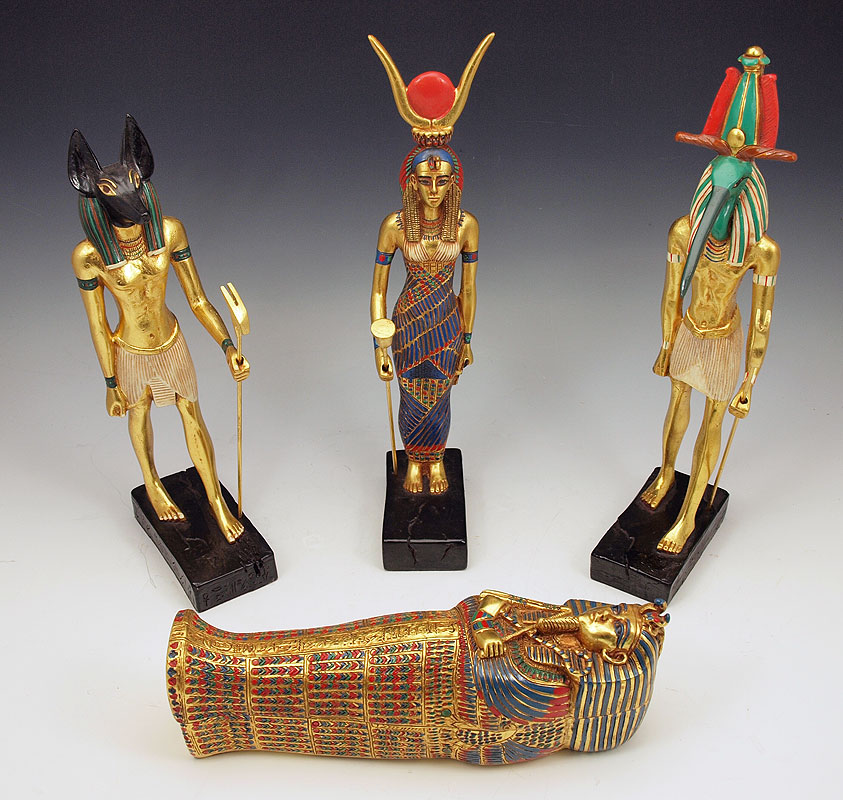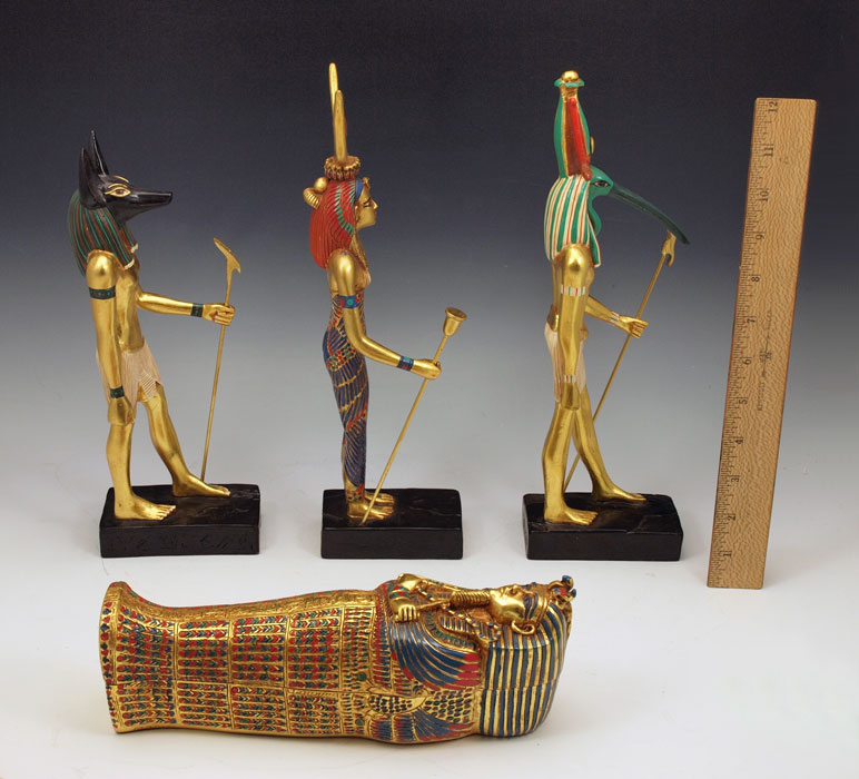EGYPTIAN COLLECTIBLES from ARTISANS GUILD INTERNATIONAL: 4 pieces to include, Canopic Coffin 9 1/2'' x 3 1/2'' x 3''; Anubis 10 3/4'' x 4'' x 2''; Seth 12 1/4'' x 4'' x 2''; and Thoth 12 1/4'' x 4'' x 2''. Purchased from The Museum Co.