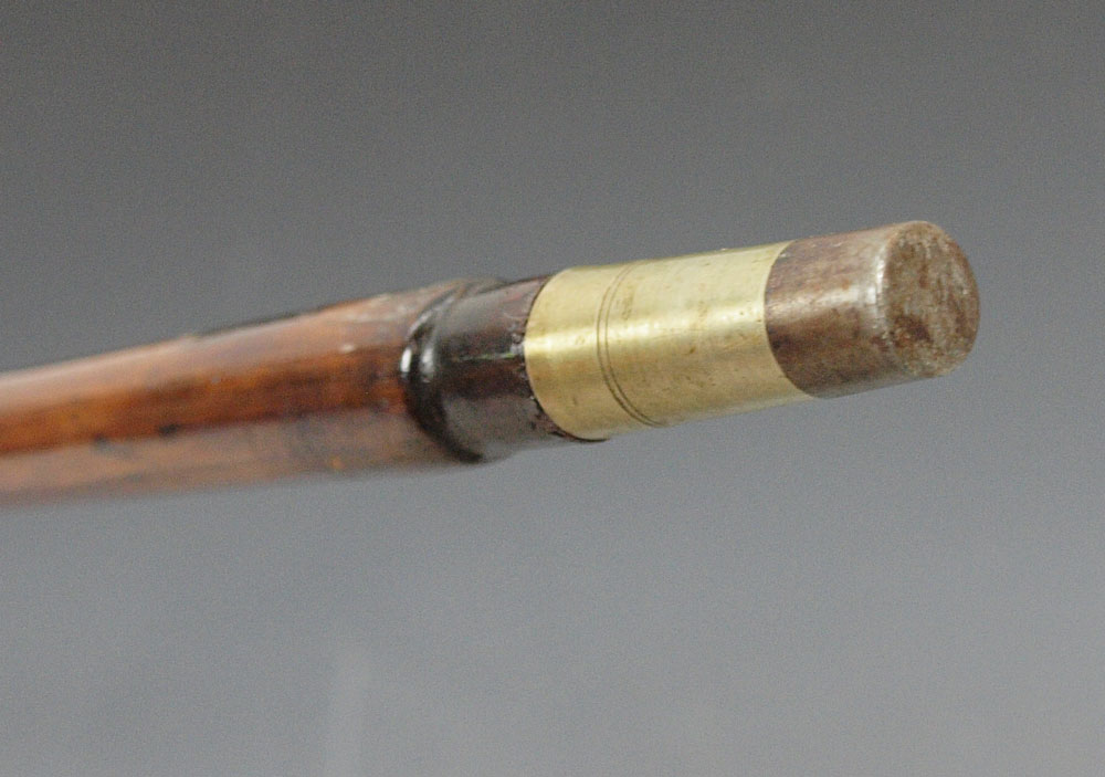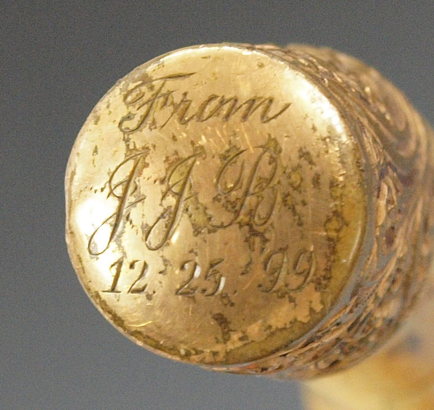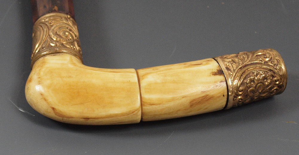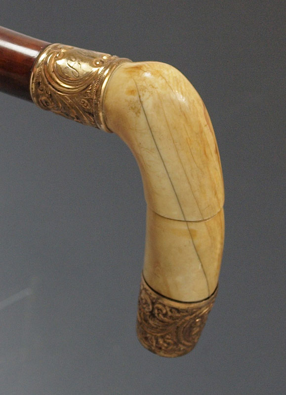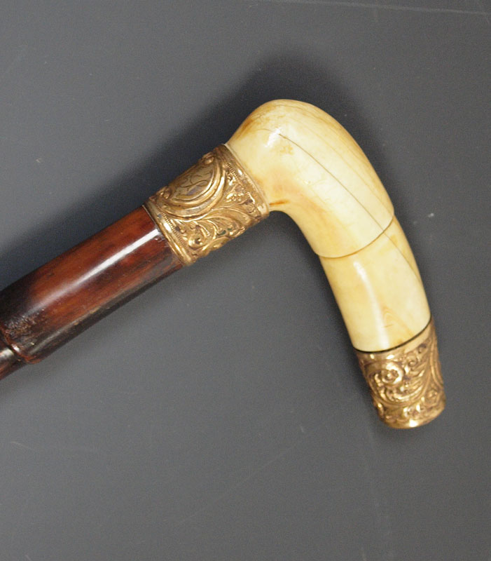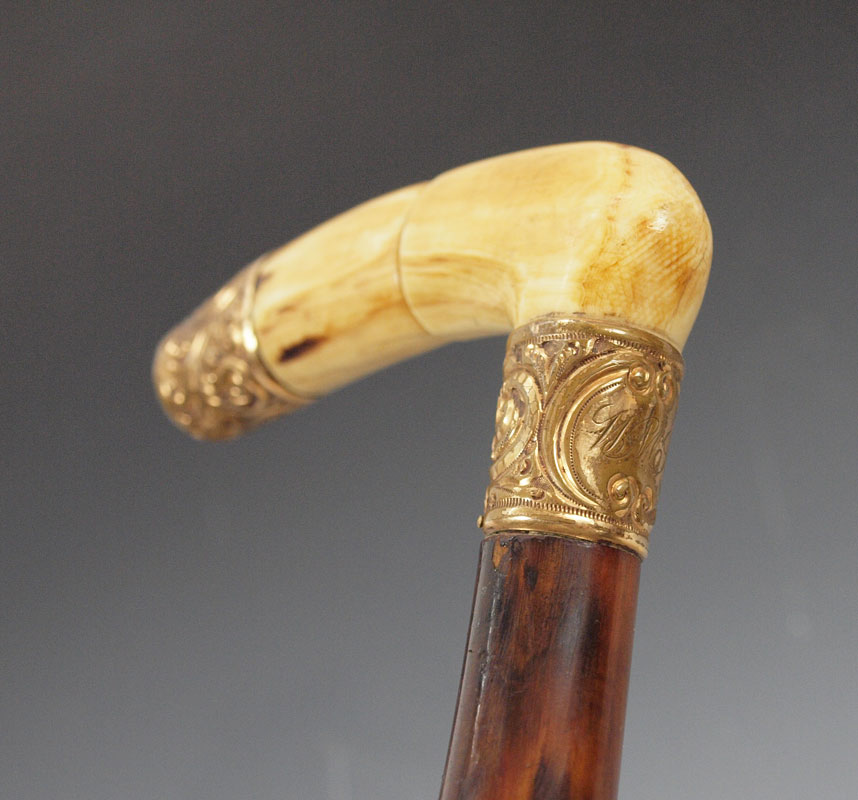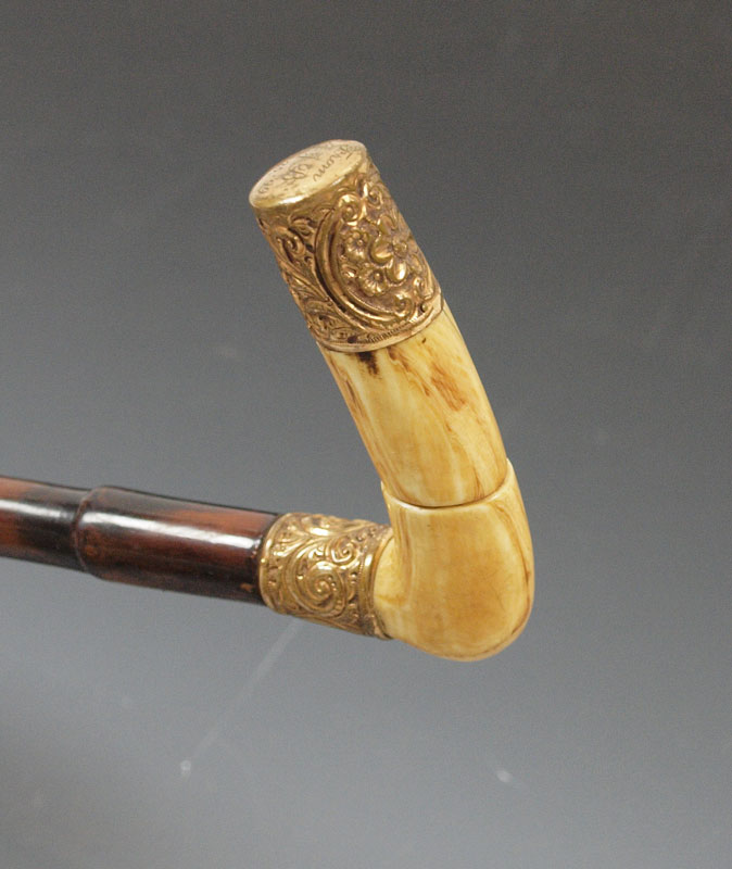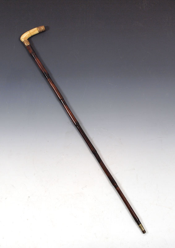 GOLD FILLED & IVORY HANDLE BAMBOO CANE: Monogrammed and dedicated 1899 gold filled mounts on ivory handle. Bamboo wood body and brass tip. 35 1/4'' long.