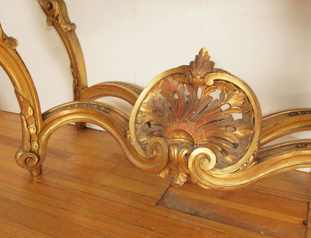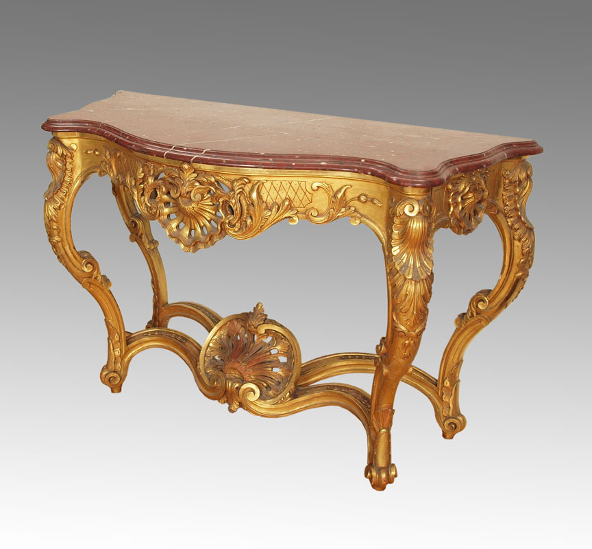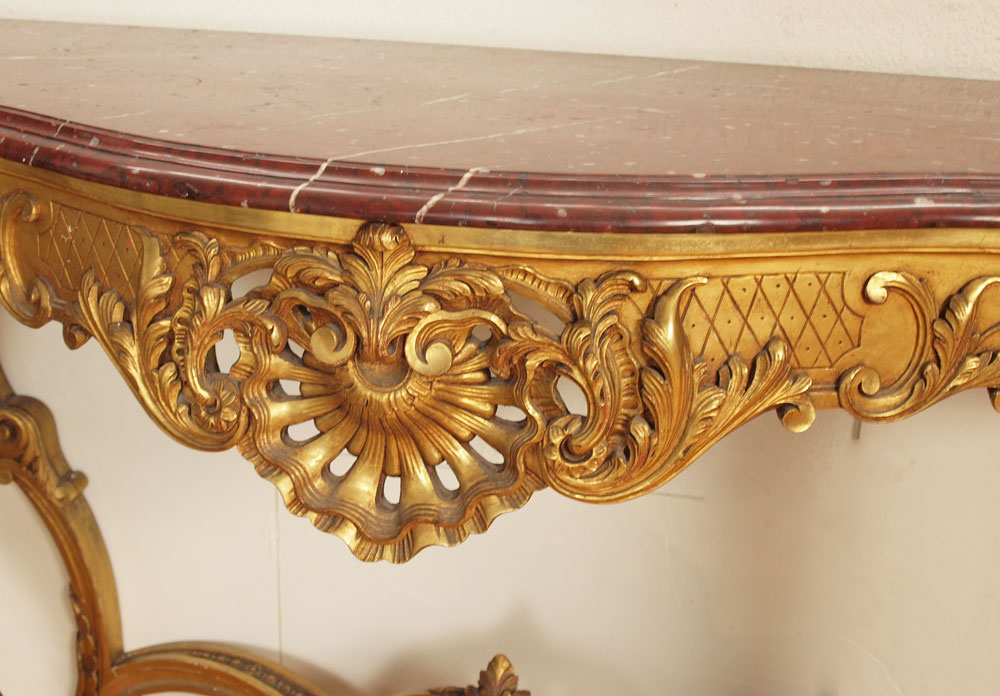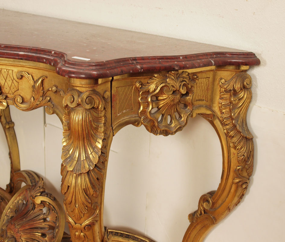 ITALIAN ROCOCO GILT WOOD MARBLE TOP CONSOLE TABLE: Ca. early 1900's. Shaped rouge marble over serpentine base, pierced and carved apron, heavily carved and curved legs, stretchers join at the center with a large shell carved finial. From a Bronxville N.Y. castle once owned by Albert Williams, past president IBM. Approx. 36''h. x 53'' x 22''.