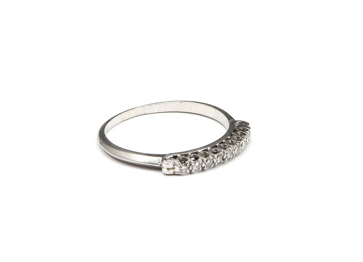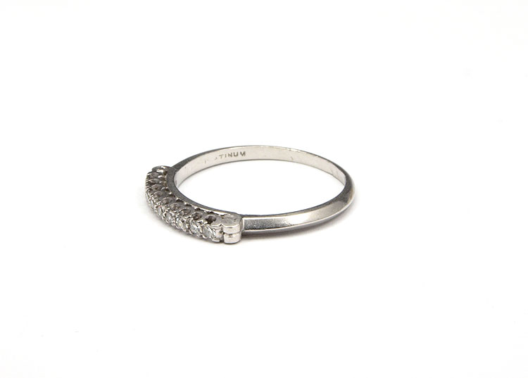 PLATINUM DIAMOND BAND RING: Platinum band shows off 9 round single or Swiss cut diamonds, approx. .20 Ct., rated VS in clarity and G-H in color. The diamonds are fishtail prong set. Size 8. Weight 2.7 grams.