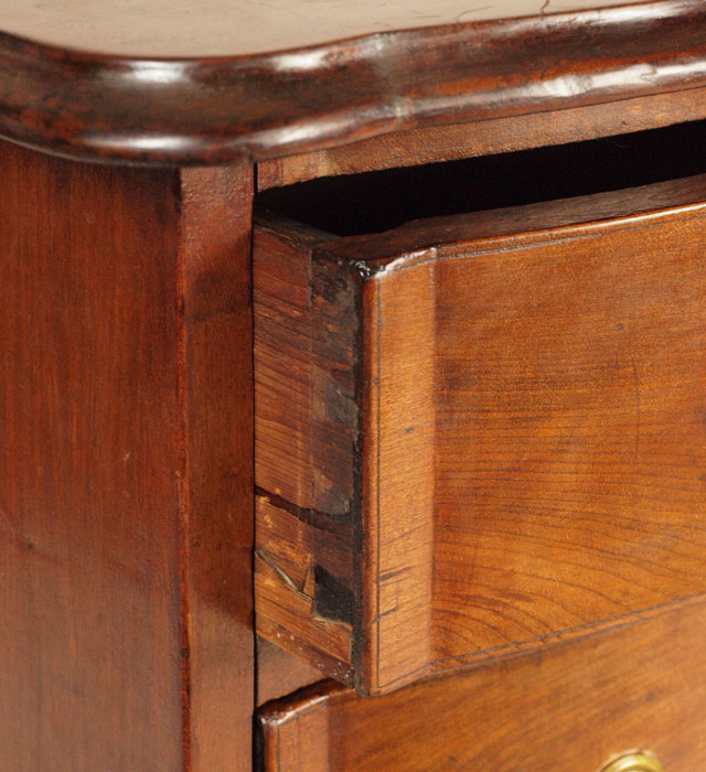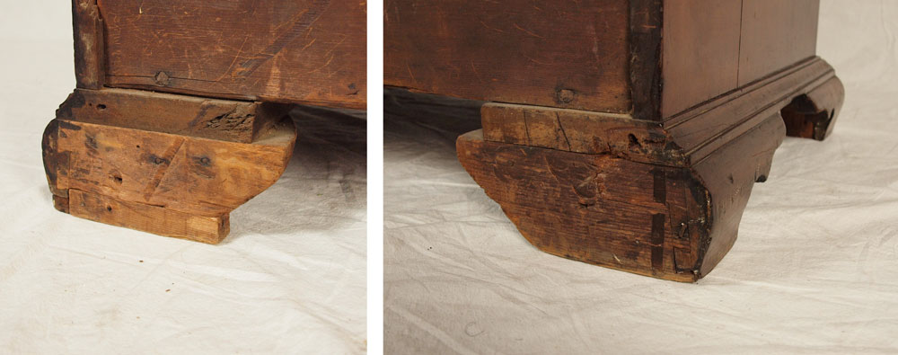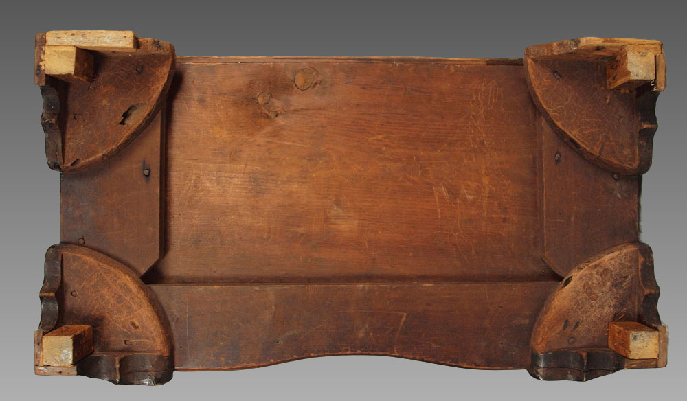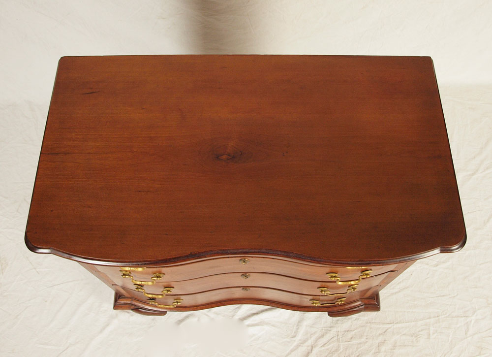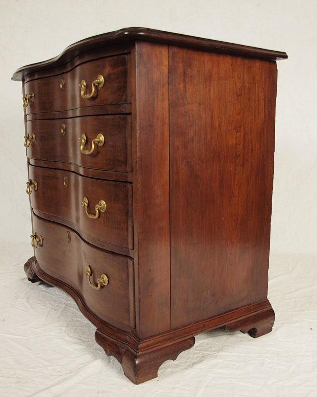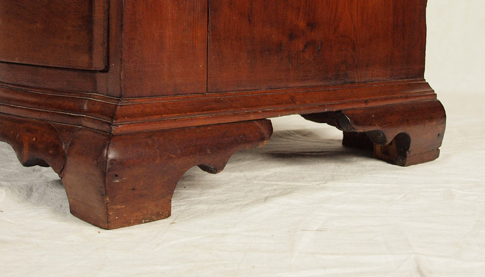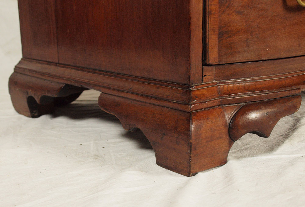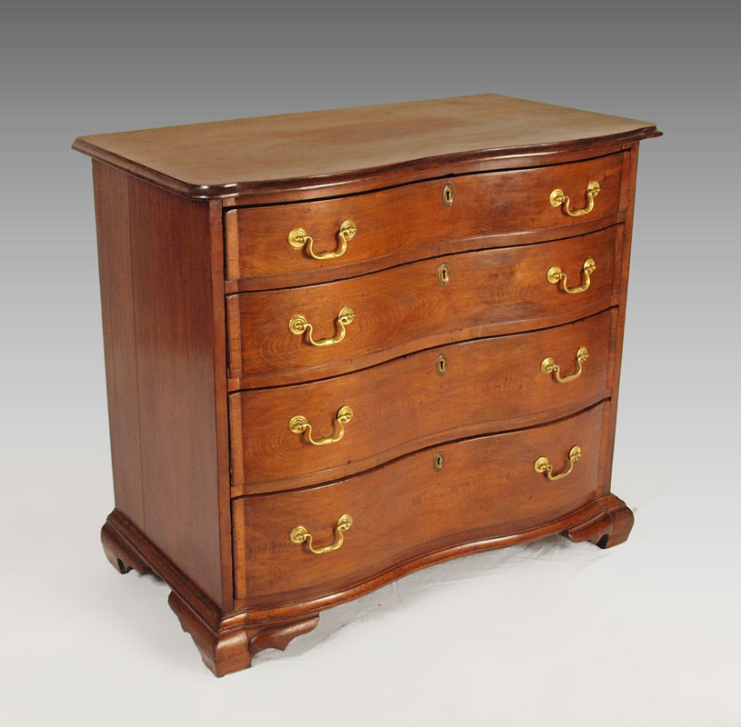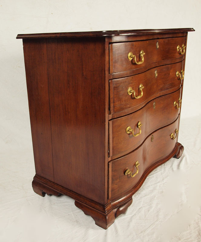 CHIPPENDALE MAHOGANY OXBOW BUREAU: New England, 1750-1780. A very choice example according to Israel Sack. Note how the serpentine curve stops at the edge of the drawer and follows into the top of the bracket feet creating a bolder and more compressed curve. Unfortunately, all four feet have been ended. 31 1/2'' h. x 35 3/4'' x 19 3/4'' Similar piece in Israel Sack's Fine Points of Furniture pg 98.