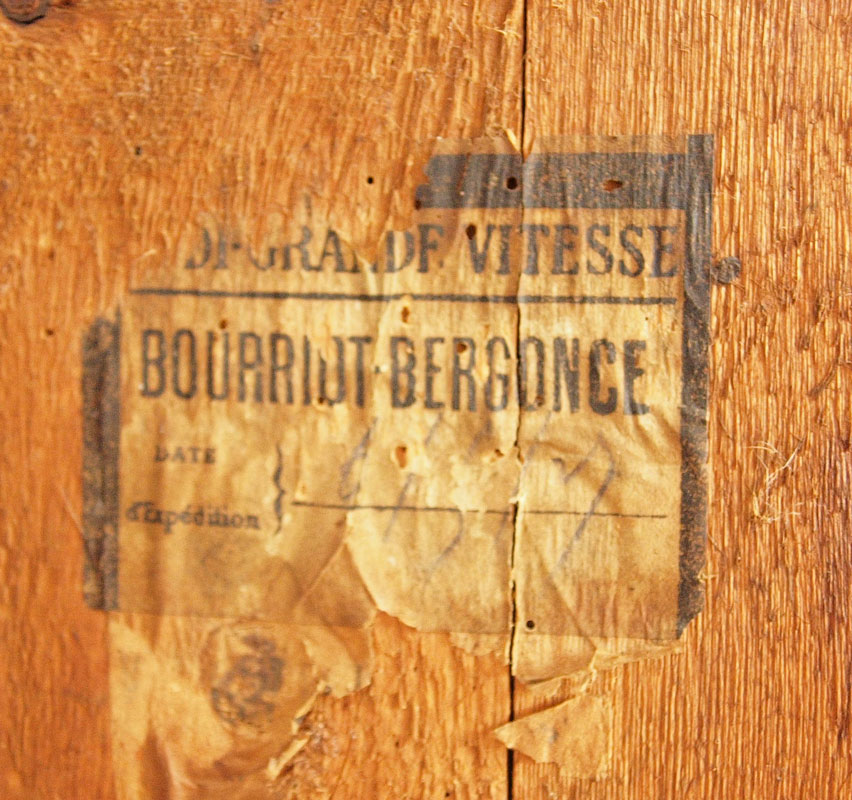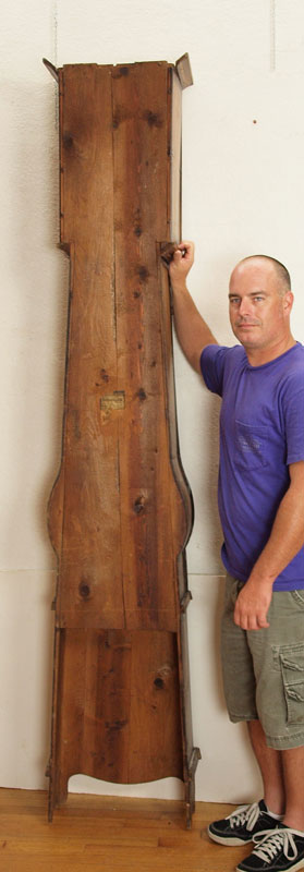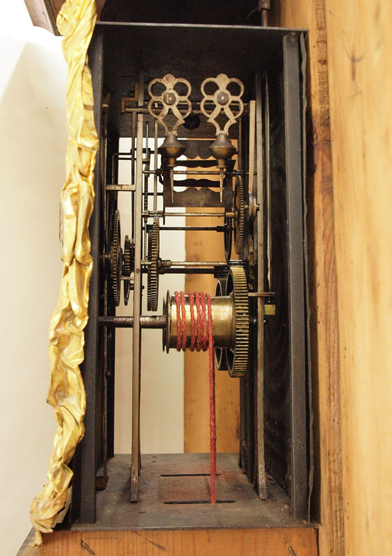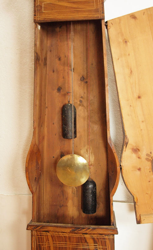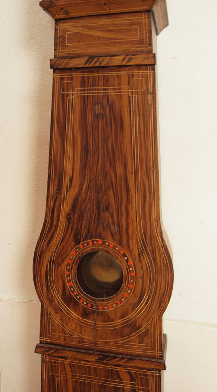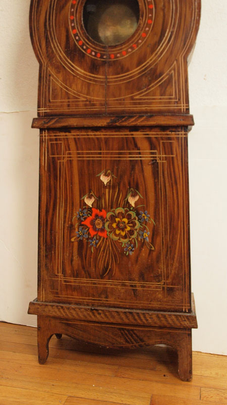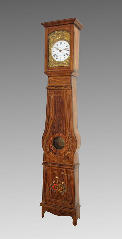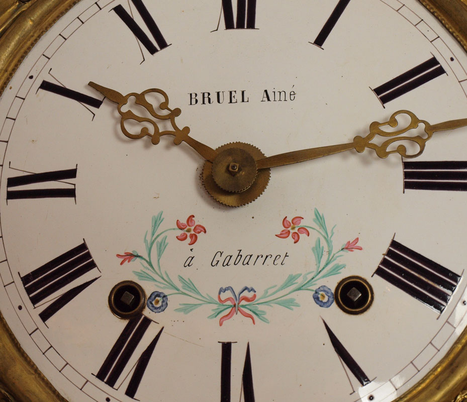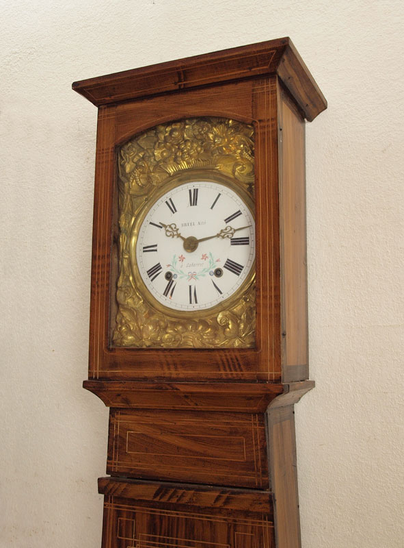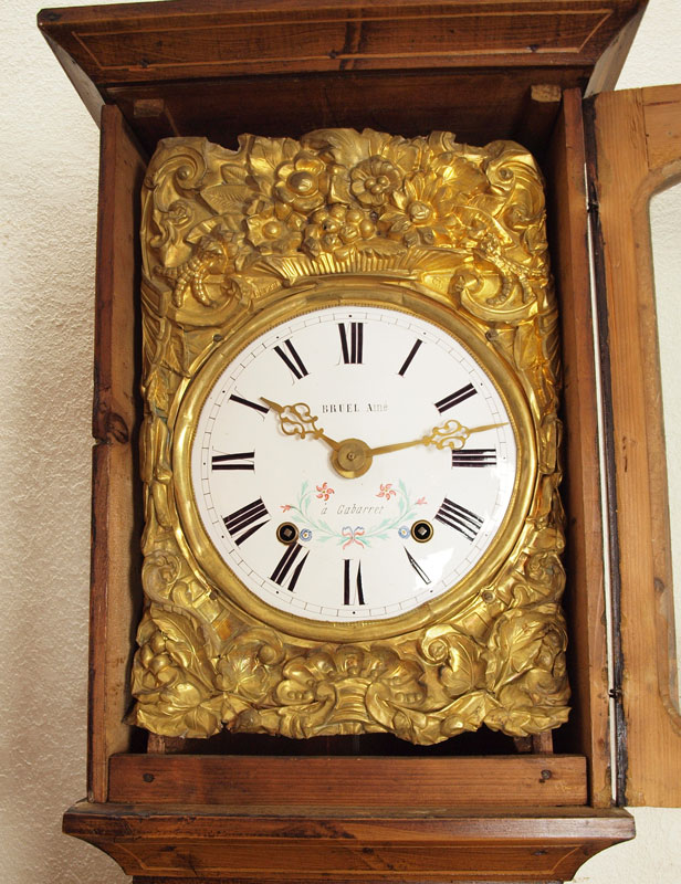 FRENCH MORBIER GRAIN PAINTED LONGCASE CLOCK: Grain painted and artificially aged case. Enameled face with Roman numerals, hand pained floral swag, marked ''Bruel Aine a Gabarret''. Face is framed by embossed brass with floral design. 2 weight and pendulum French movement. 91 1/2'' h. x 17 1/2'' x 7 3/4''. Crank in office.