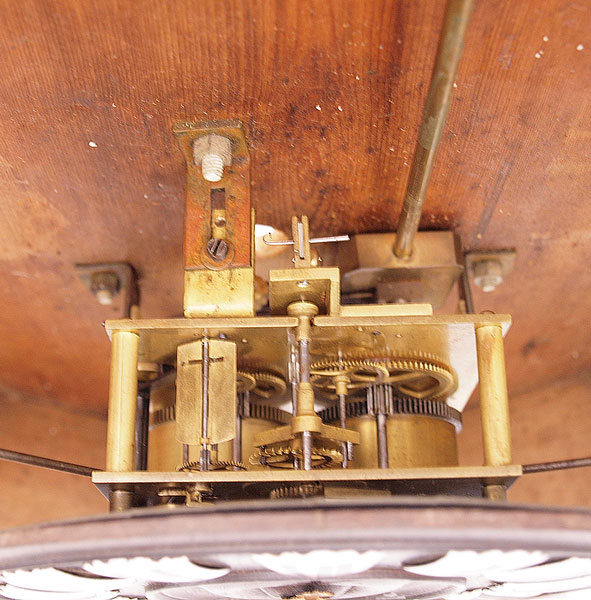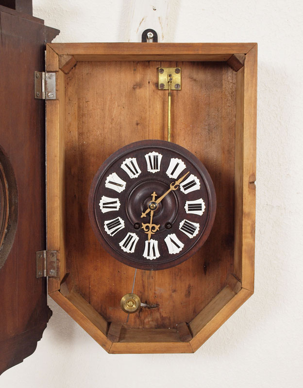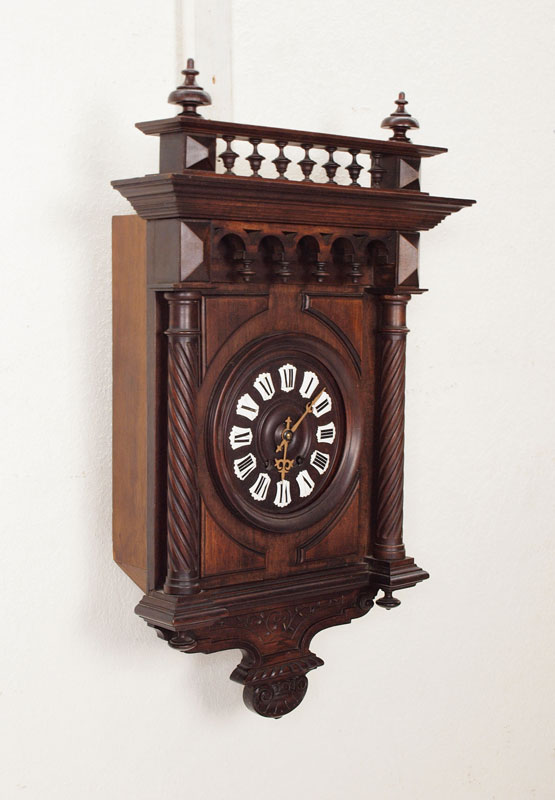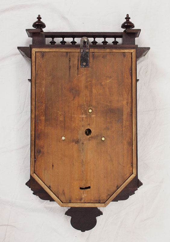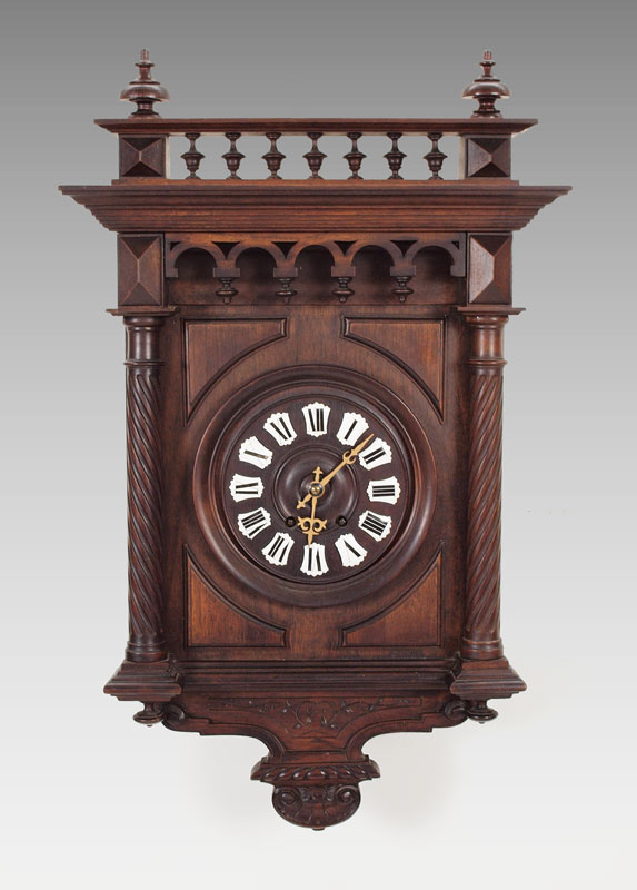 FRENCH CARVED WALL CLOCK: Nicely carved with full columns, gallery and turned finials. Roman numerals on enamel plaques. Time and strike movement. 28'' h. x 16 1/2'' x 7 1/2''. Key in office, pendulum in case.