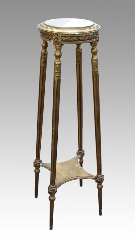 CARVED & GILT WOOD FERN STAND WITH MARBLE TOP: Carved and gesso acanthus leaf design rims the top of four ribbed and tapered legs. Lower shelf supported by four legs. Overall gilt finish with the round marble top. 44'' h. x 13'' dia.