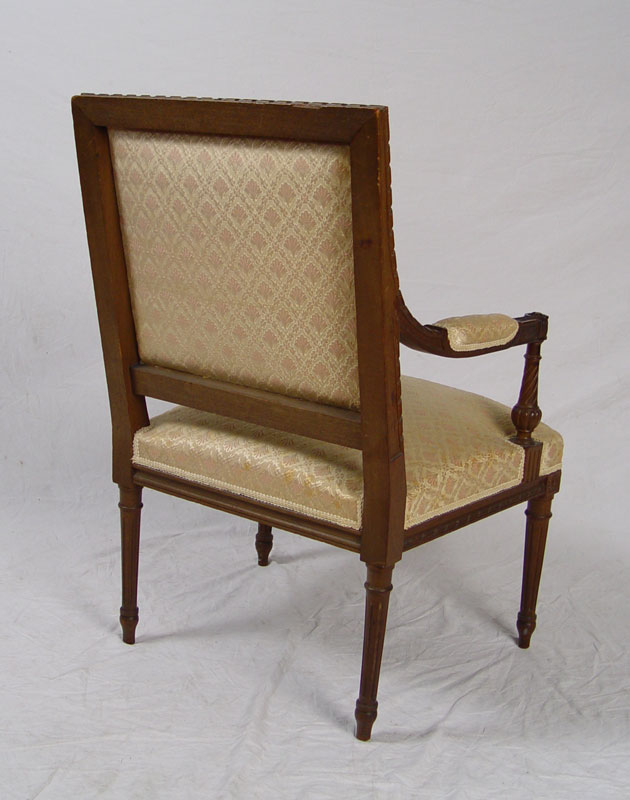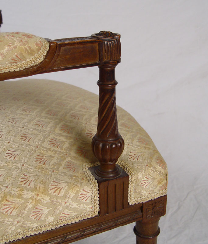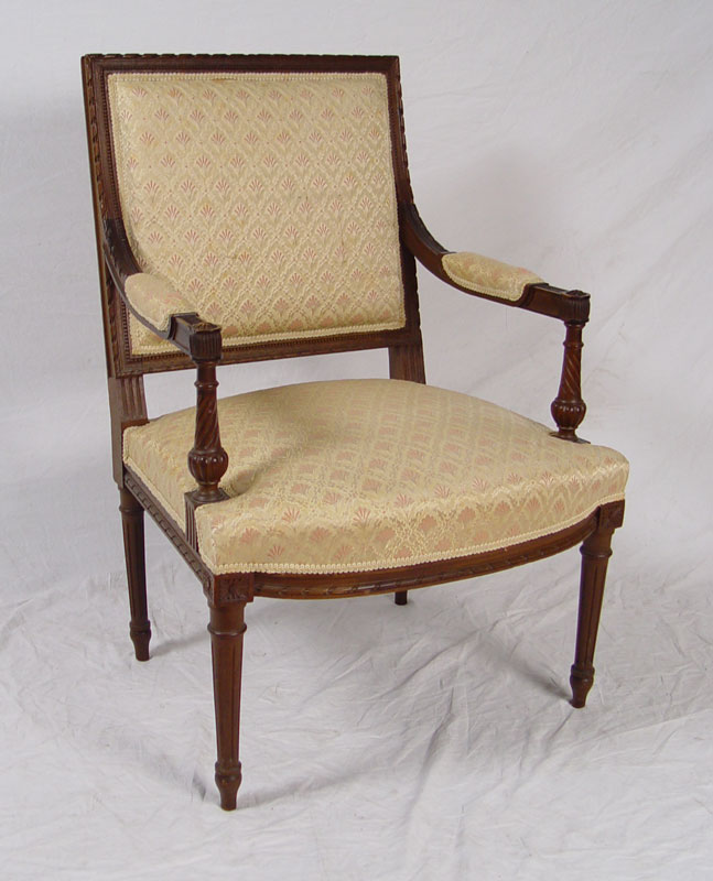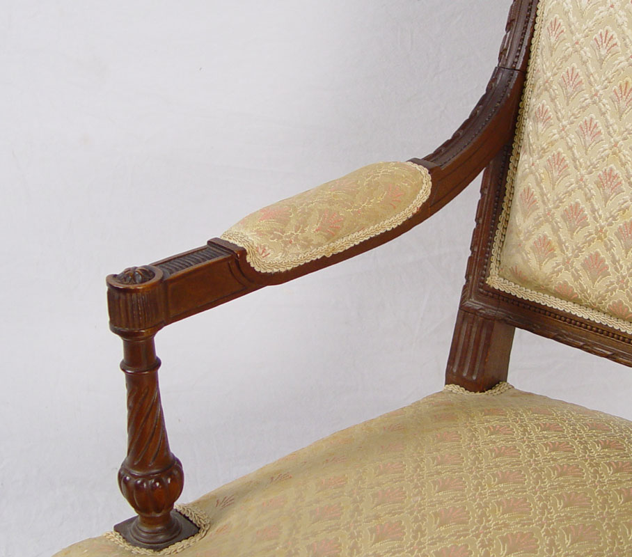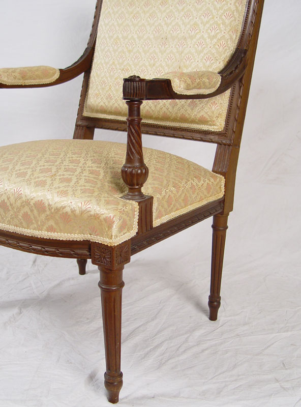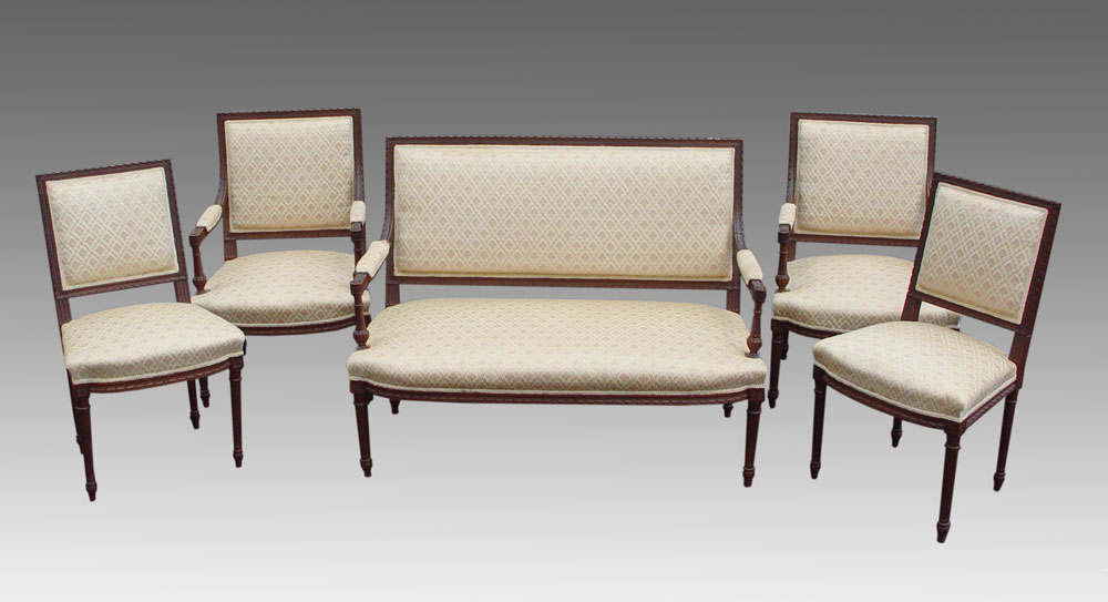 5 PIECE FRENCH CARVED SALON SUITE: Ribbon carved frame with upholstered back and seat. Upholstered arm with carved twisted supports, ribbed and tapered legs. Settee 37'' h. x 49'' x 28''. Chairs 36'' h. x 25'' x 25''.