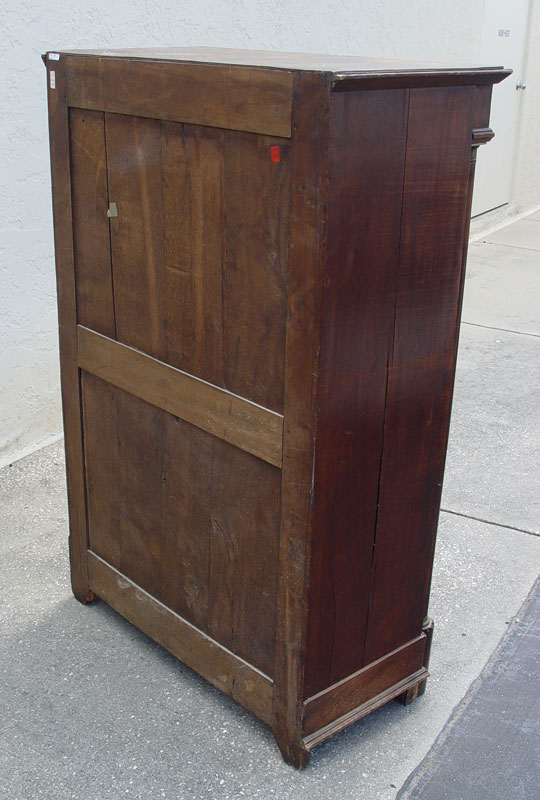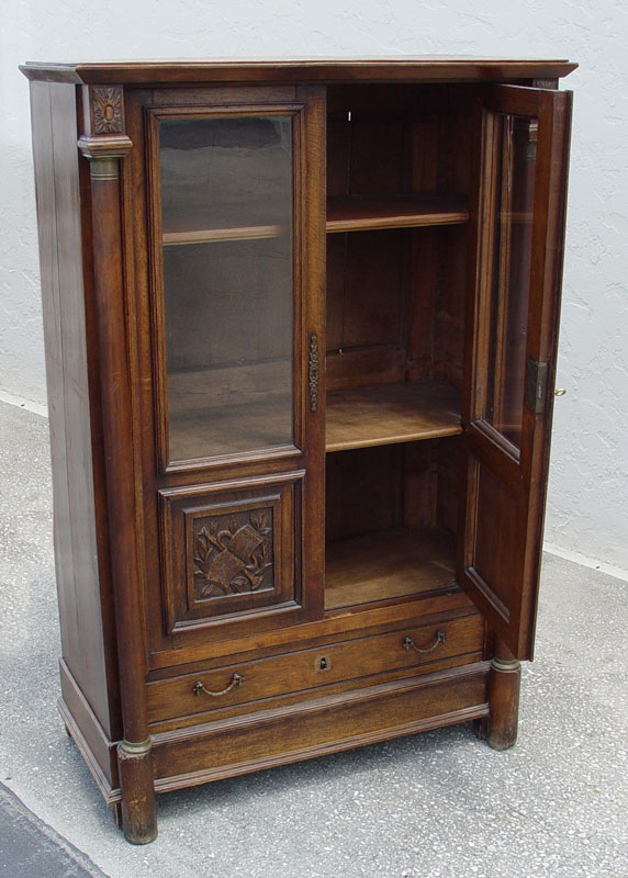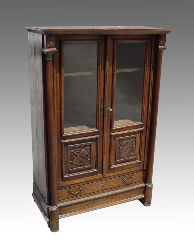 19th C FRENCH 2 DOOR BOOKCASE WITH 2 GLASS DOORS: 2 glass doors with lower carved panels. Adjustable shelves. Lower section with single lockable drawer with applied metal swags. 57 1/2'' tall x 37 1/2'' x 19'' deep.