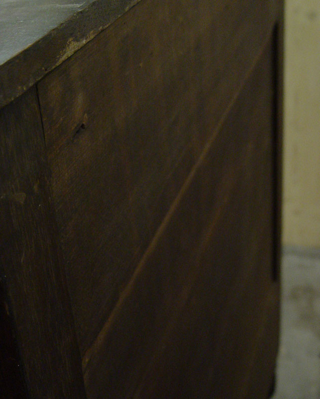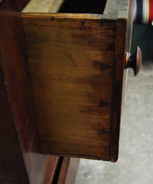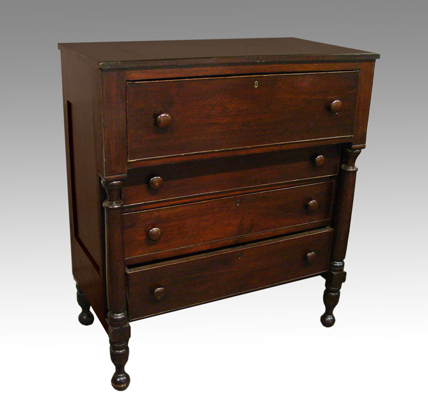 4 DRAWER MAHOGANY EMPIRE CHEST: Deep overhang drawer supported by full columned front over three drawers. Wooden button pulls. Turned legs with ball feet. 49'' h. x 42 1/2'' x 22''.