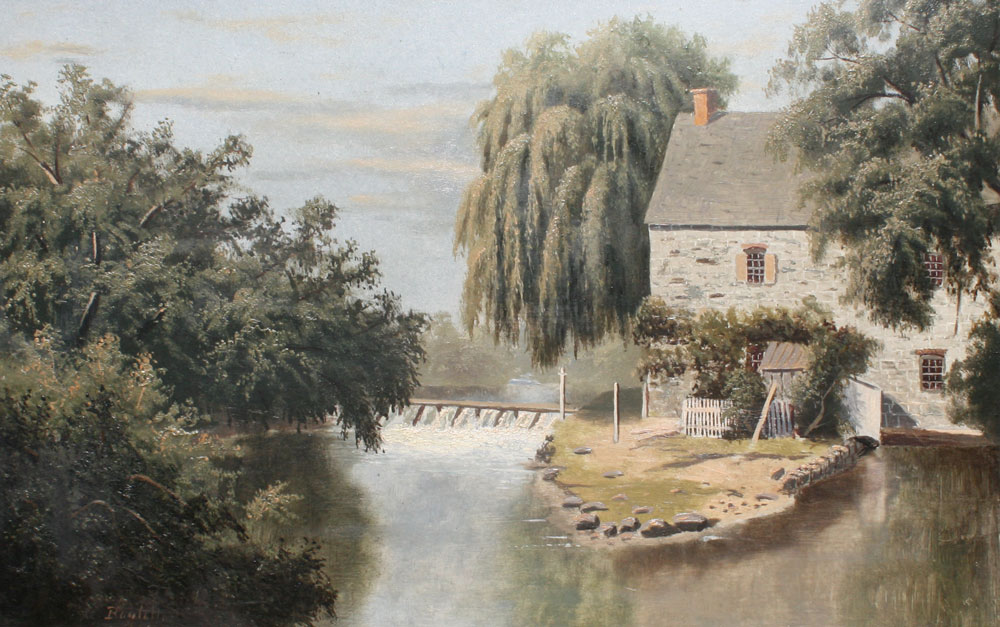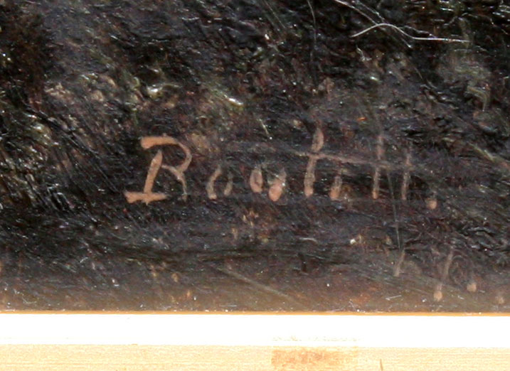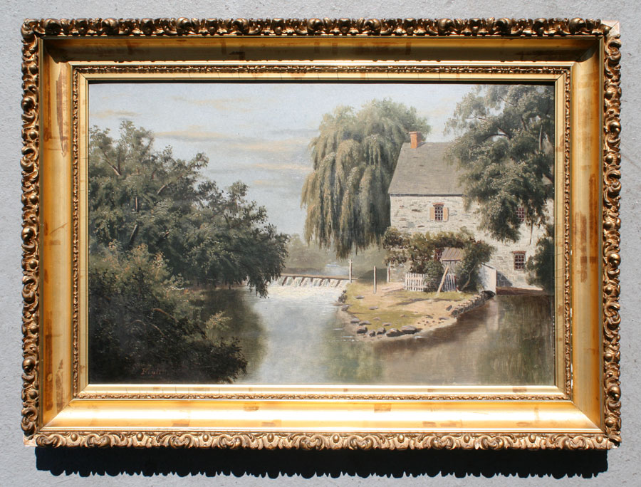19th C. LANDSCAPE WITH COUNTRY FARMHOUSE HOUSE BY WATERFALL: Illegibly signed Boatetti?, OIL/Board, 12 1/2'' x 18 1/2'', 19th C. frame with wear and missing gesso 15 1/2'' x 21 1/2''.