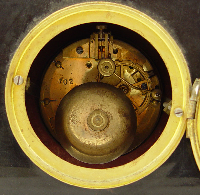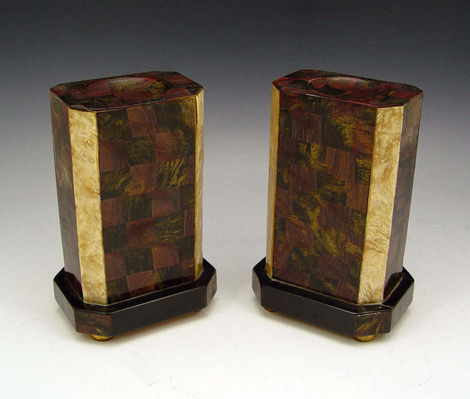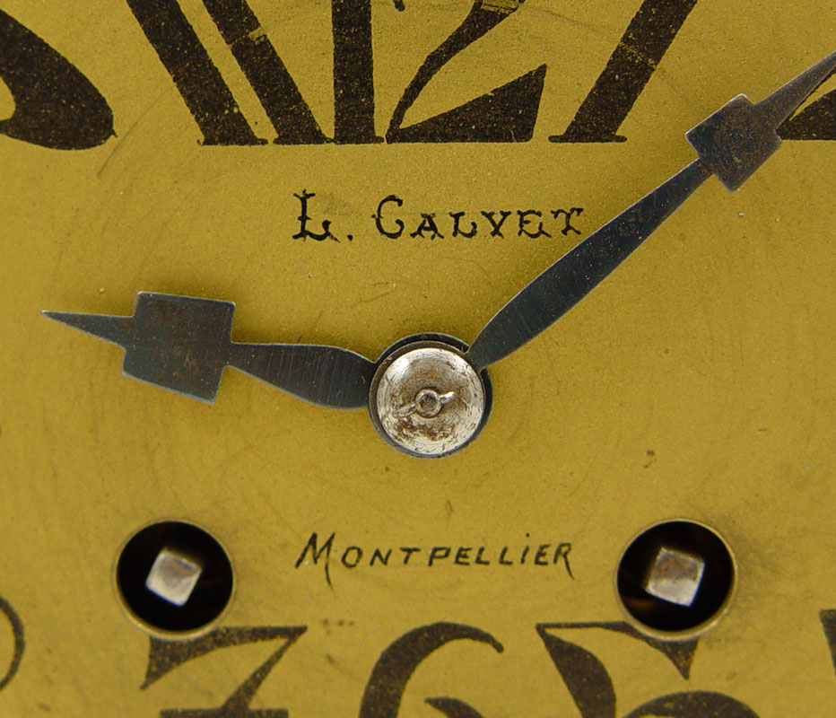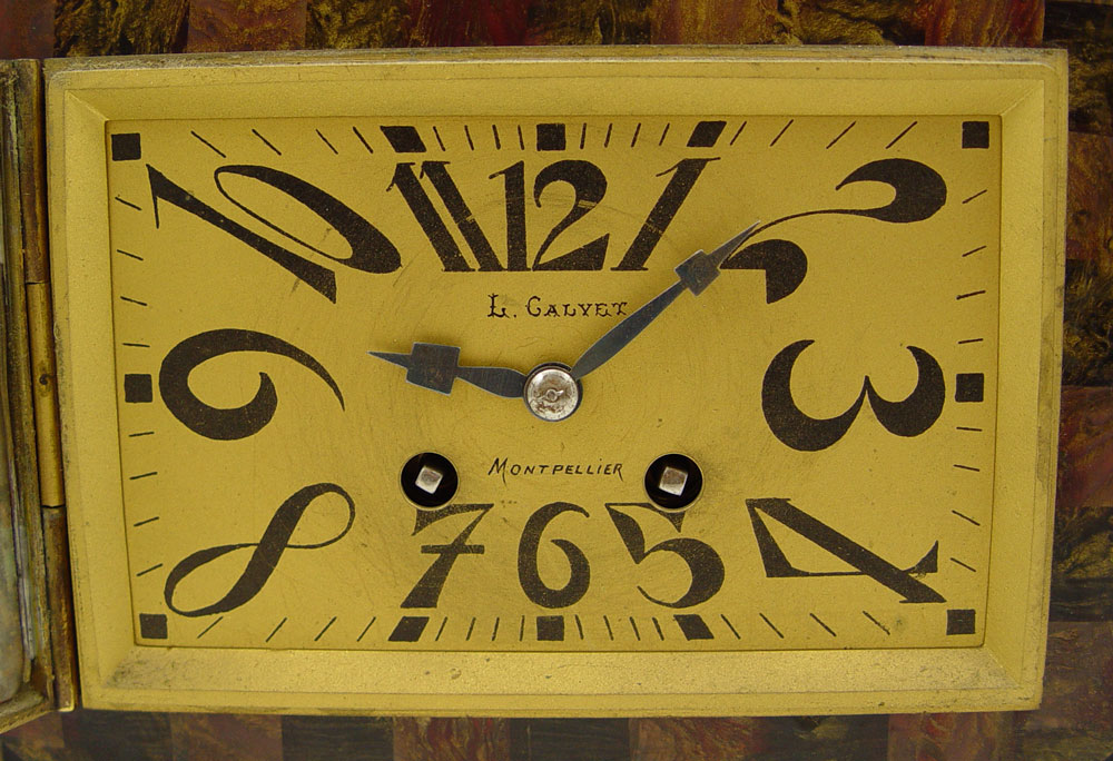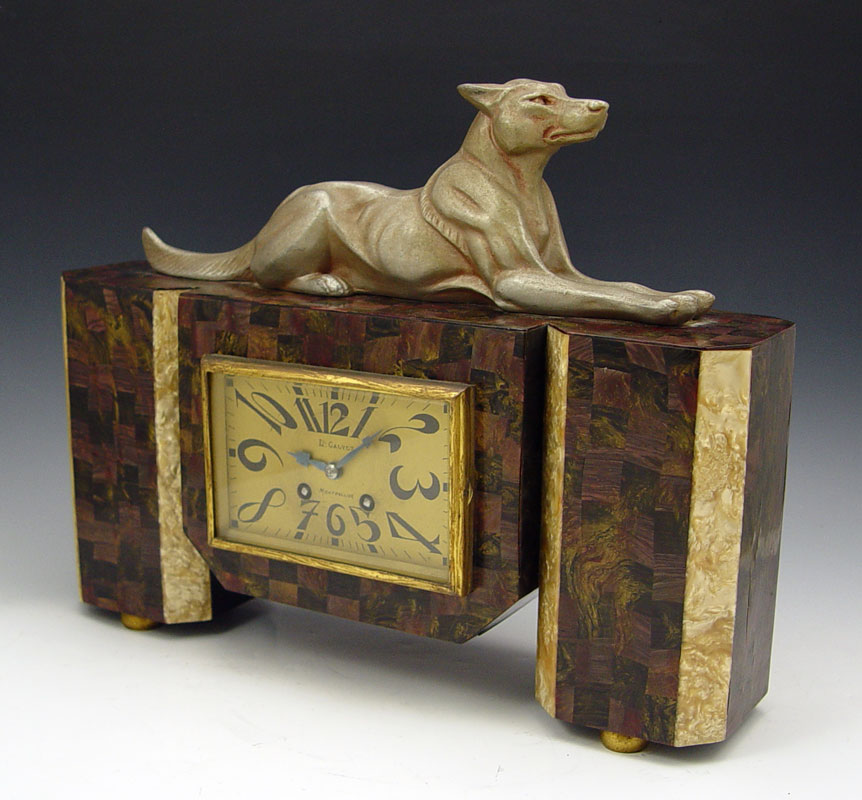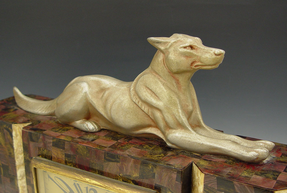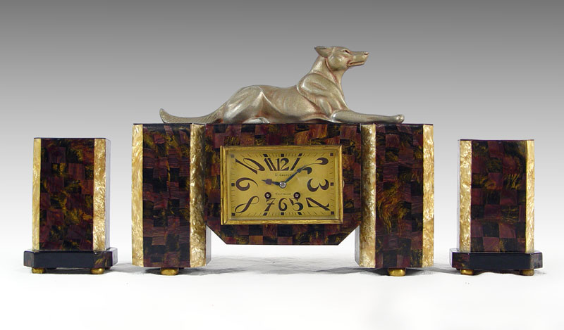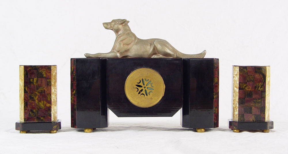 FRENCH FIGURAL ART DECO CLOCK GARNITURE SET: Cast metal German Shepherd dog with parquetry celluloid over wood case. Metal face marked J. Galvet Montpellier with Arabic numerals. 12 1/2'' x 15 3/4'' x 4 3/4''. Sold with pair of matching garniture, 7 1/8'' x 3 1/2'' x 4 3/4''.