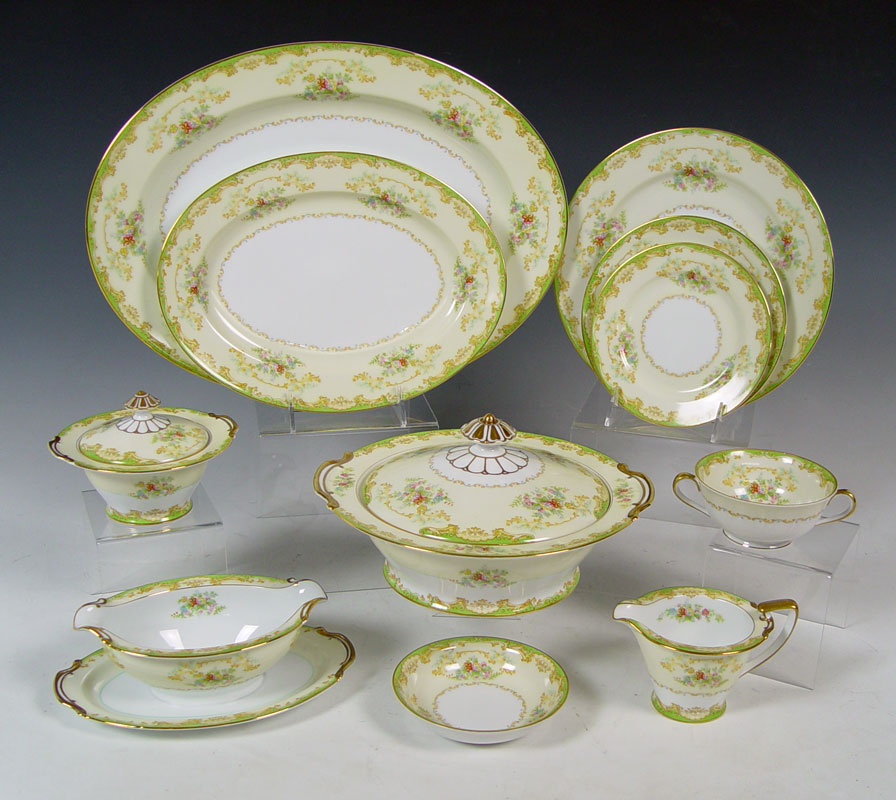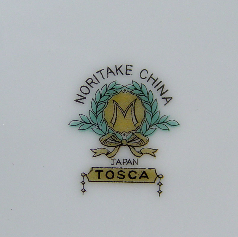 NORITAKE TOSCA CHINA SERVICE FOR 12: 90 pieces to include 12 each of dinner plates, salad plates, bread plates, cream soups, dessert bowls, cups, and saucers. Also Large oval platter, smaller platter, covered vegetable, creamer, sugar, and gravy with underplate.