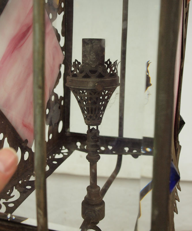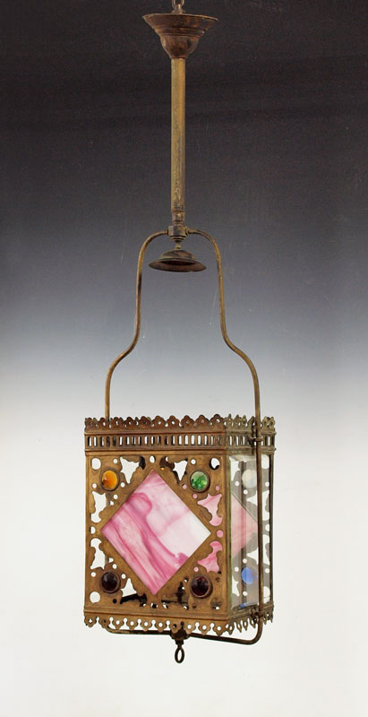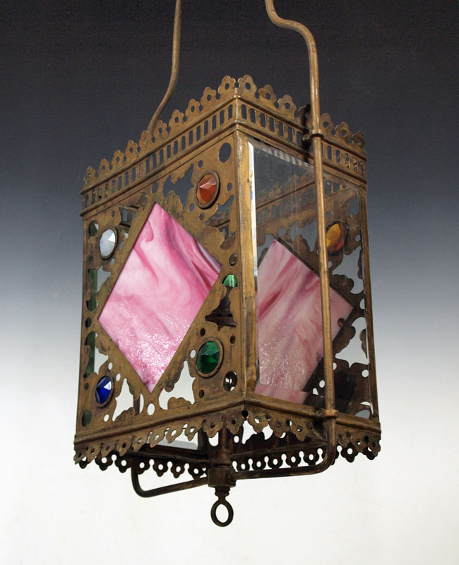 VICTORIAN GAS CEILING LIGHT: Beveled and slag glass panels with faceted bull eyes, 40'' l. overall, the shade is 10'' x 7''.