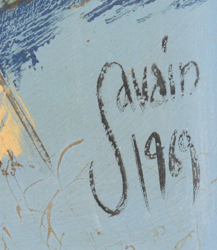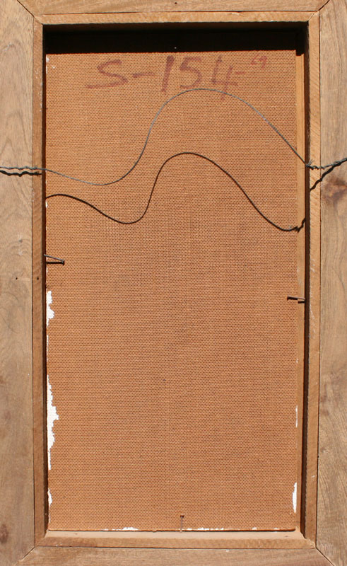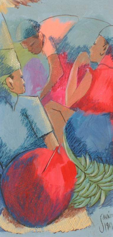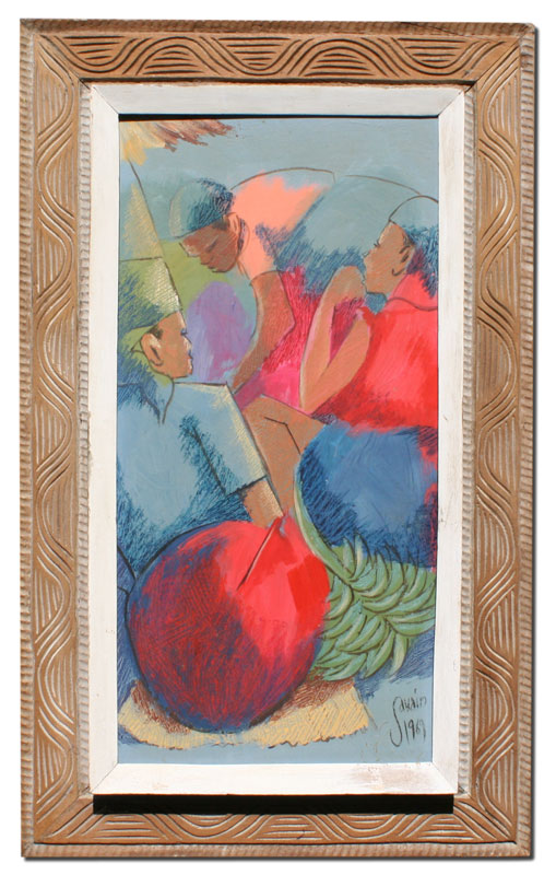 SAVAIN, Petion, (Haitian, 1906-1973): Banana Pickers, OIL/Masonite, sight size 20'' x 10'', signed and dated 1969 in the lower right, carved framed 25 1/2'' x 15 1/2.