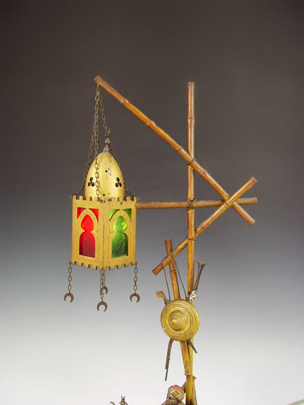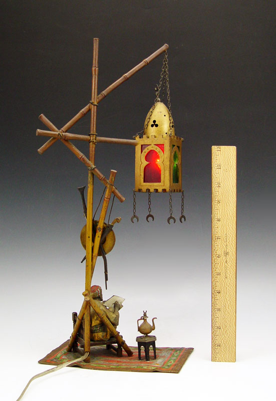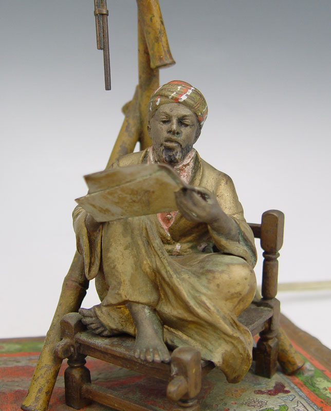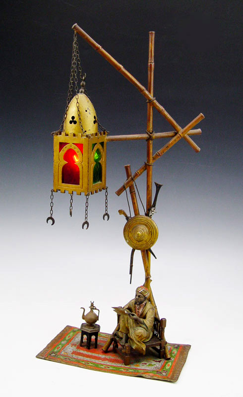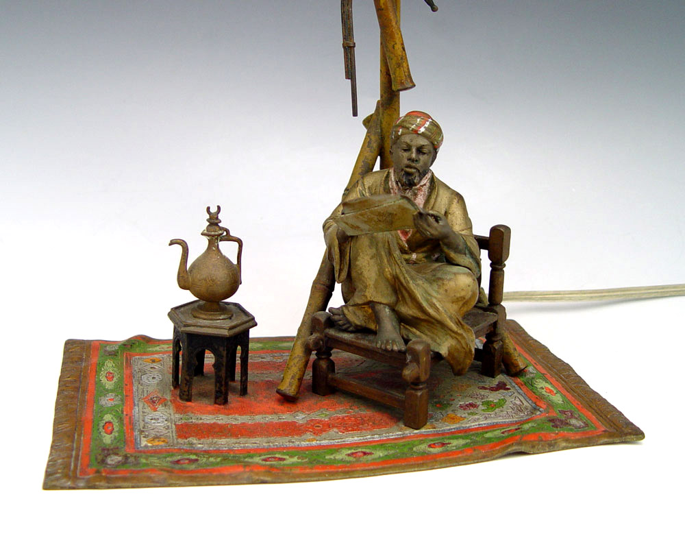 BERGMAN AUSTRIAN BRONZE ORIENTALIST FIGURAL LAMP: Franz Xavier Bergman (1861-1936). Cold painted bronze figure on a Persian ''rug''. Impressed B vase mark along with Nam Greb (Bergman spelled backwards). 18'' tall, the ''rug'' is 5'' x 8''.