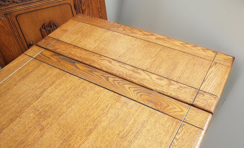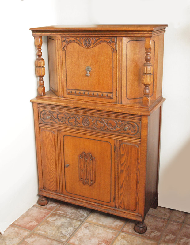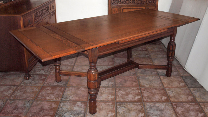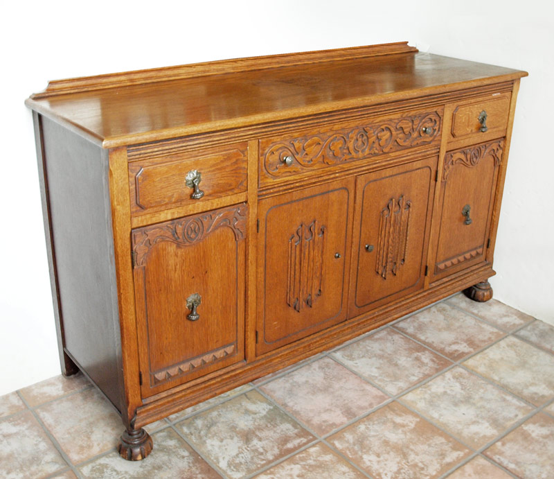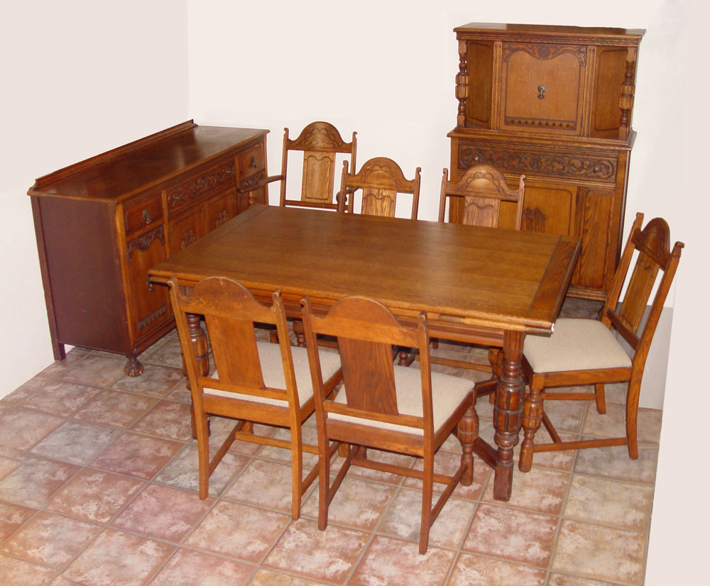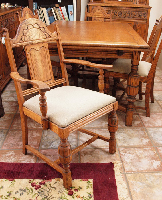 8 PIECE JACOBEAN STYLE RED OAK DINING SUITE: Early 20th C. Table, 6 chairs, sideboard and china cabinet. Applied cut decoration, drop pulls (one missing) and bun feet on the SIDEBOARD, 37'' tall x 62'' x 20''. Table 30 1/2'' h. x 89 1/2'' x 37 3/4'' fully extended.