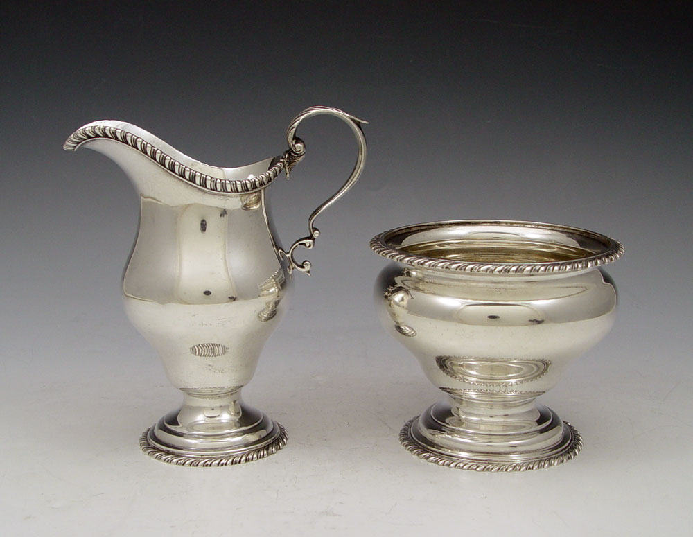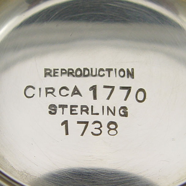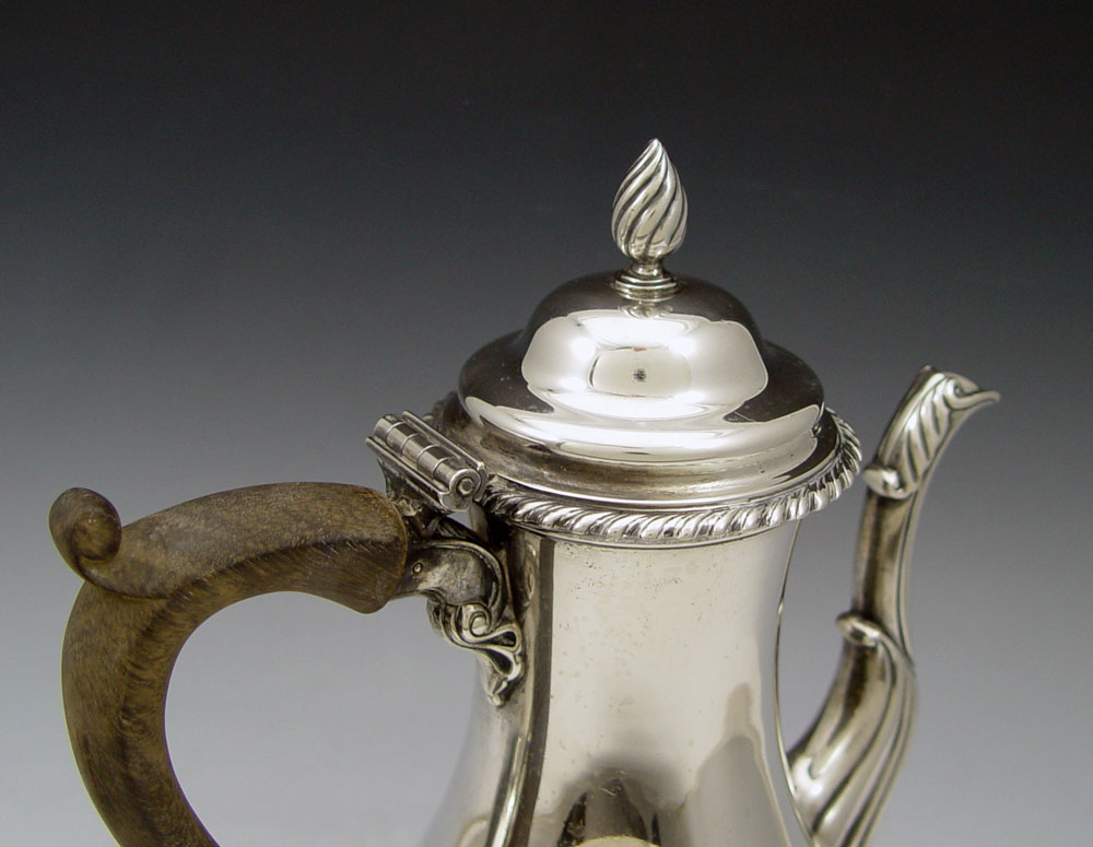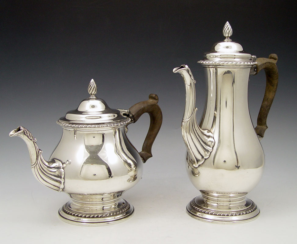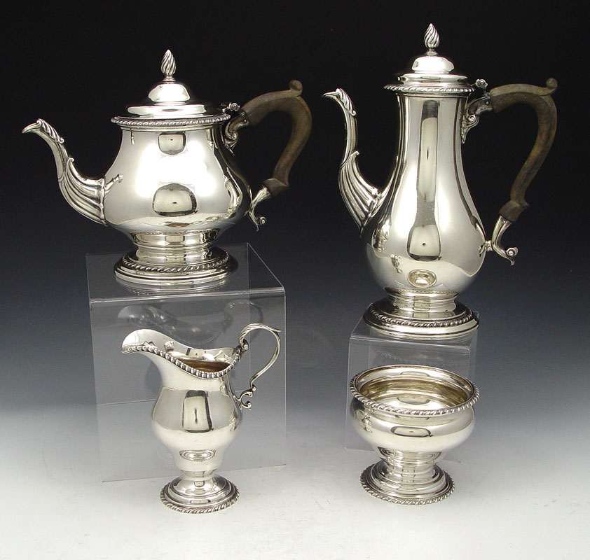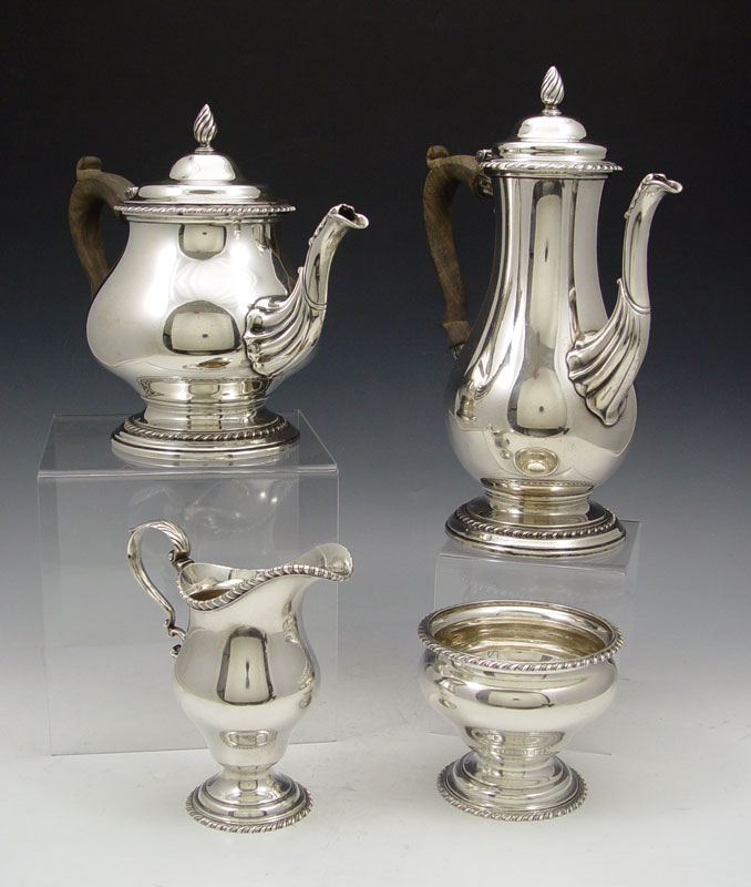 4 PIECE STERLING COFFEE / TEA SET: Marked Reproduction Circa 1770 Sterling, no other maker or dealer marks to include 1) Coffee pot with hinged lid, wood handle. 10 1/4'' h x 8'' overall. 2) Teapot with hinged lid and wood handle. 7 1/2'' h. x 9 3/4''. 3) Open creamer, 5 1/4'' h. x 4 3/4''. 4) Open sugar 3 3/8'' h. x 4'' dia. No monograms. Approx. 66.2 troy oz., note weighed with wood handles attached.