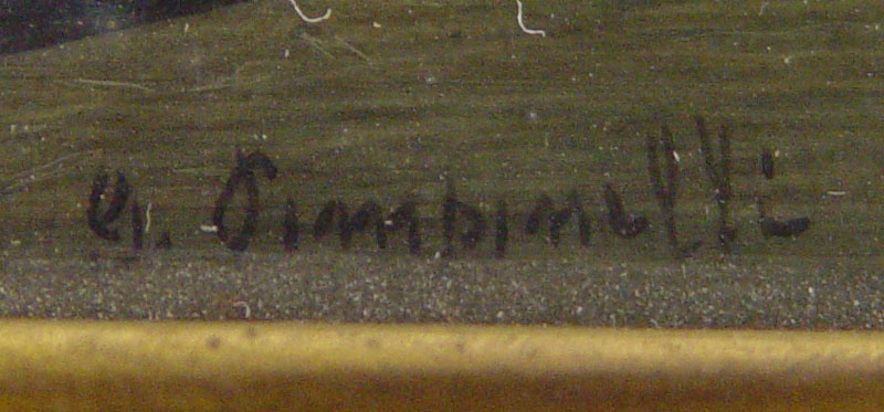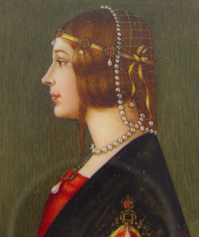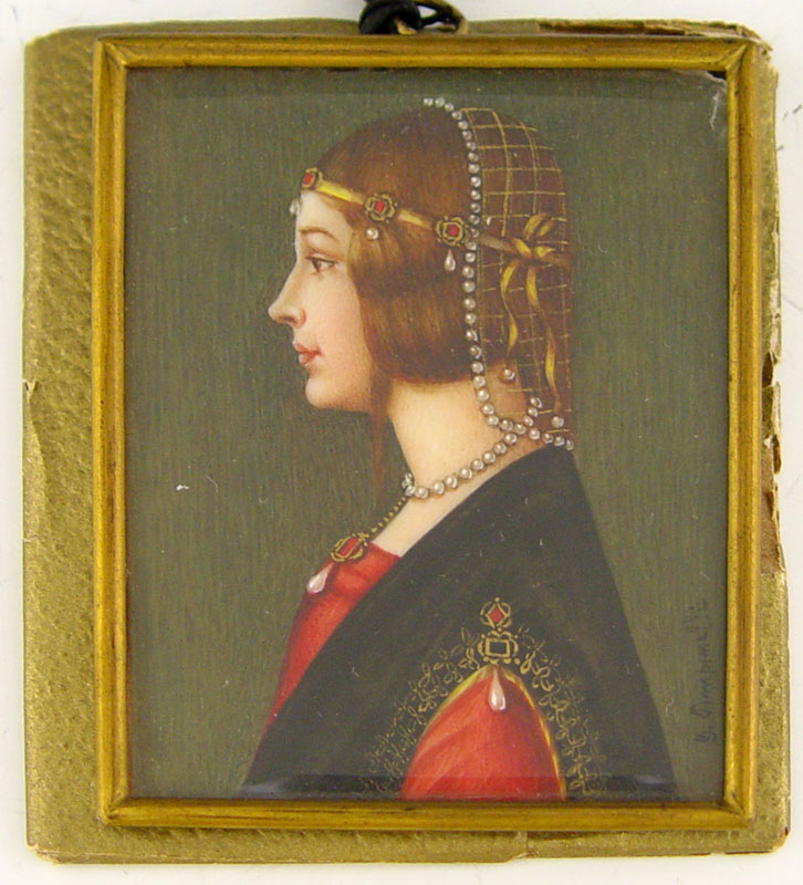 EXCEPTIONAL MINIATURE PAINTING ON IVORY: Brunette in classical attire, signed *impinelli?, 2 5/8'' x 2 1/8''.