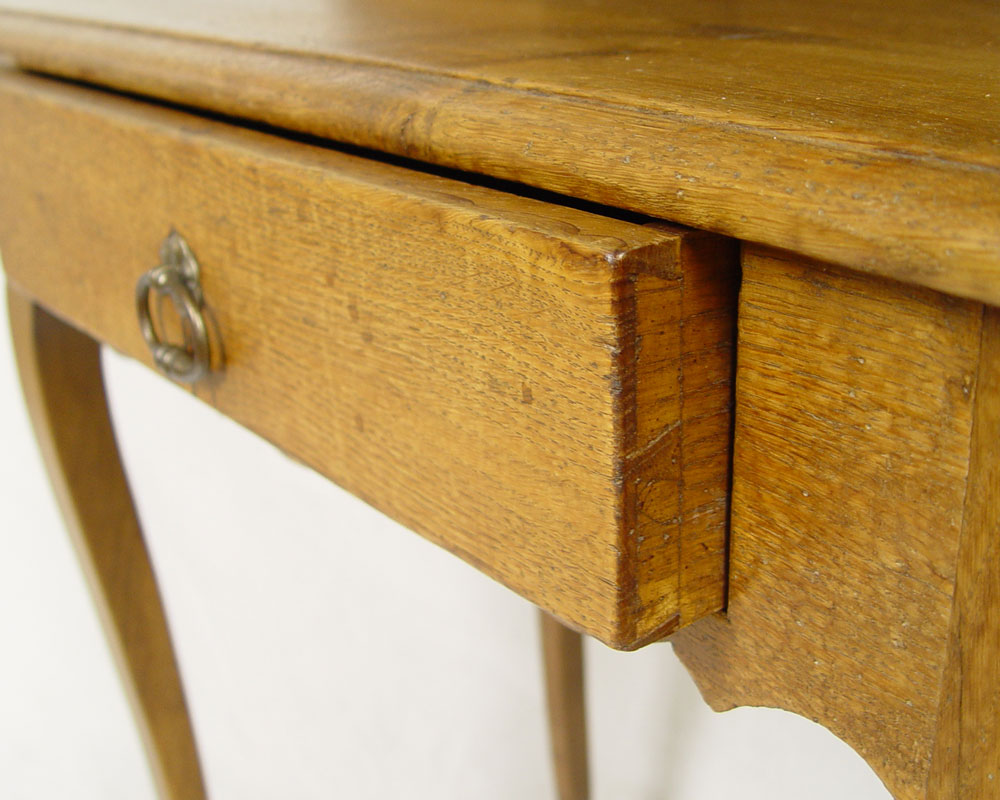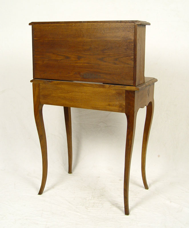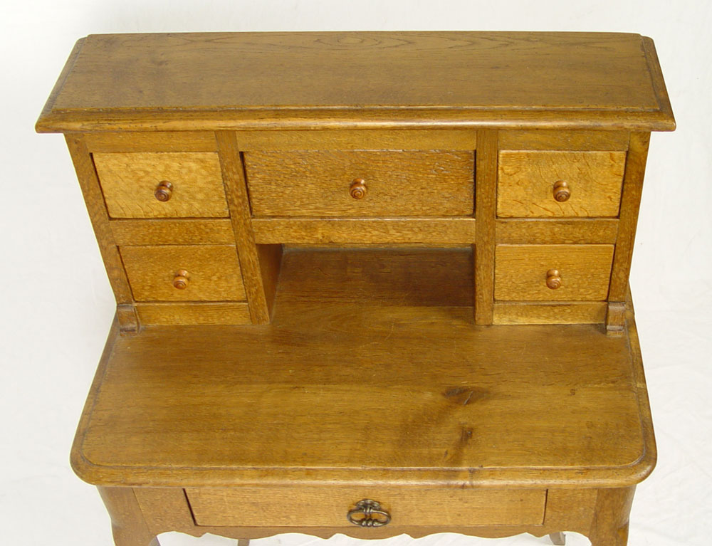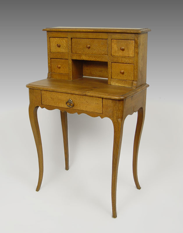 TURN OF THE CENTURY CUSTOM LADIES DESK. Dove tailed construction 5 drawer with pigeon hole resting on desk surface with one drawer and long French legs. 27 ½'' wide, 16'' deep, 44'' tall.