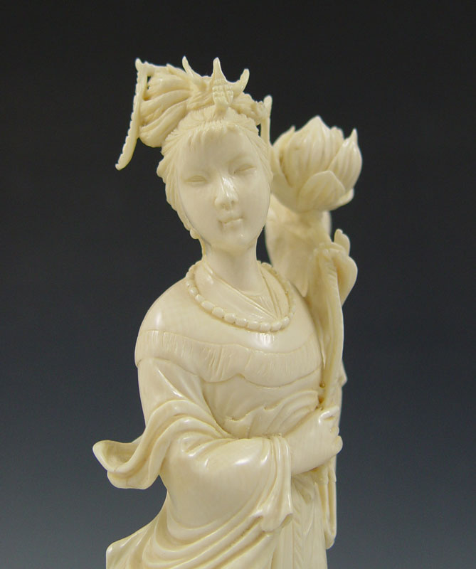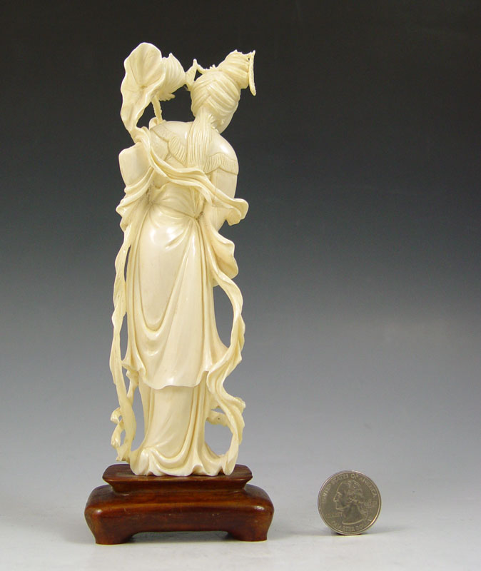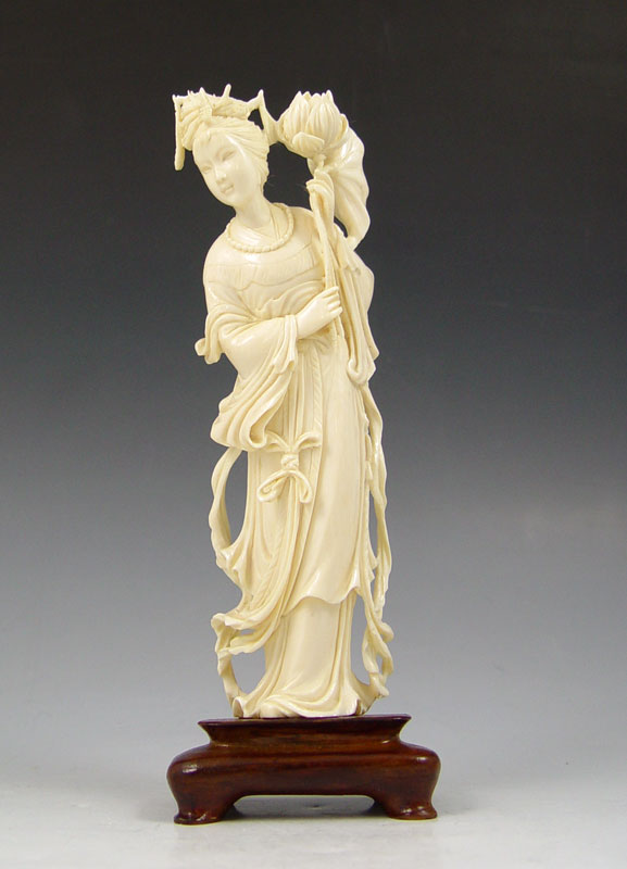 CARVED IVORY TUSK FIGURE OF GEISHA: With flowing dress, hat, holding lotus blossom. Affixed to wood stand. Measures 7 3/4'' h. excluding stand.