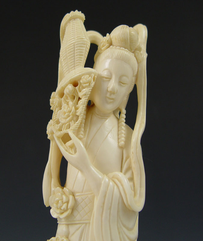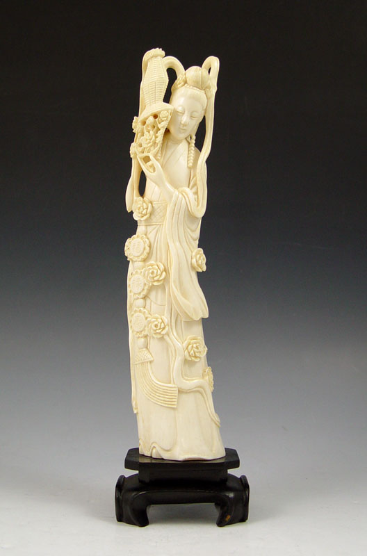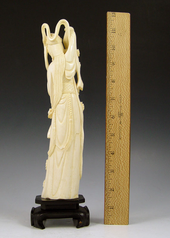 LARGE CARVED IVORY TUSK QUAN YIN: Quan yin figure with flowers and medallion sash, holding basket of flowers. Affixed to wooden stand. 10'' high excluding stand.