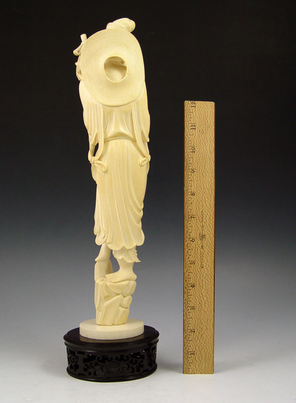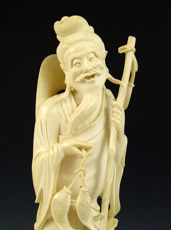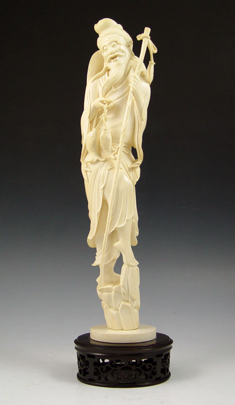 LARGE CARVED IVORY TUSK OF FISHERMAN: Figure of man with fishing pole and 3 fish standing on rocks. Affixed to carved wood base. 14 1/4'' h. excluding base.