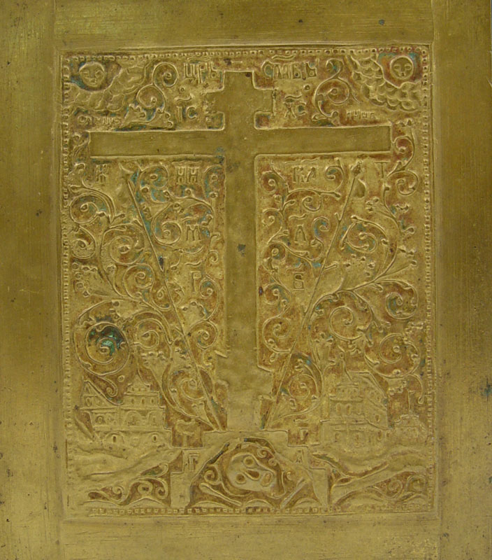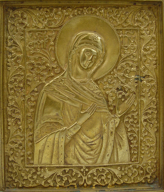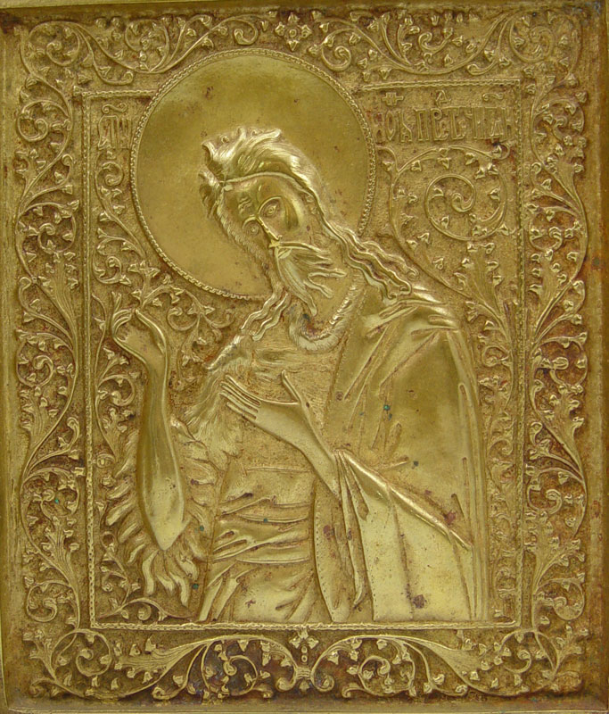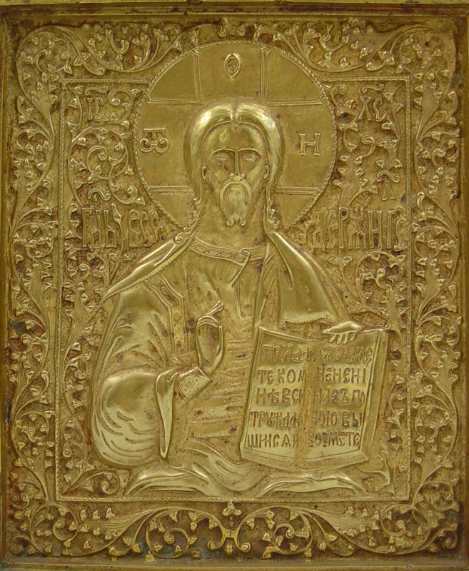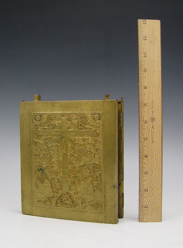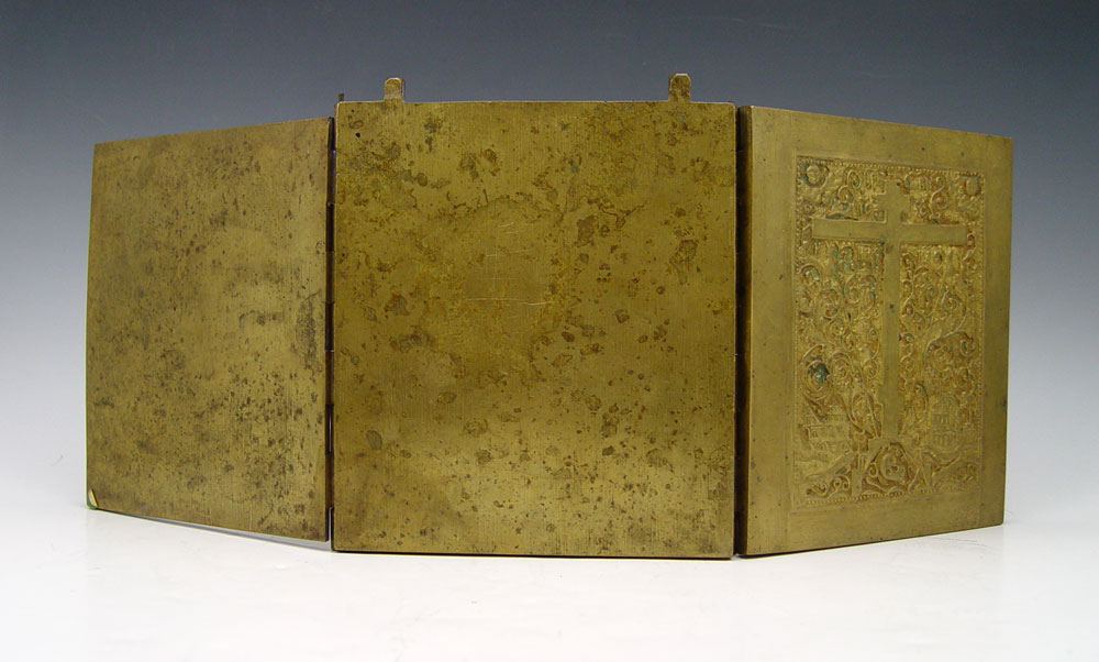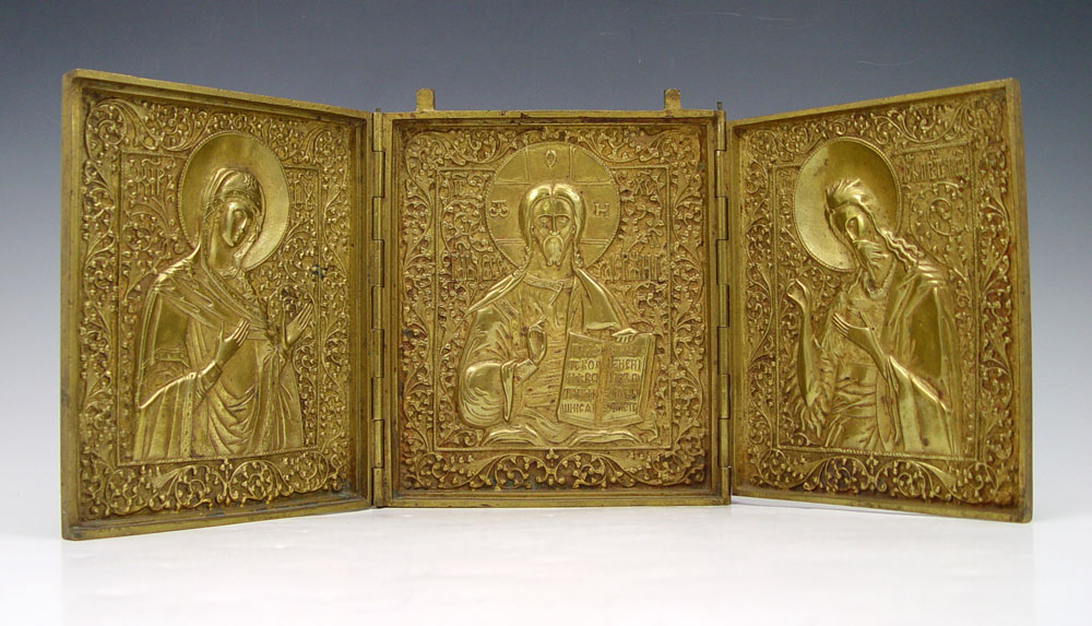 RUSSIAN BRONZE TRIPTYCH ICON: Three panels, with Christ at the center, flanked by The Virgin Mary and John the Baptist. Each panel measures 7 1/4'' x 6 1/2''. Extends to approx. 18 1/2'' length