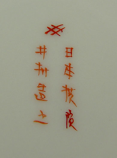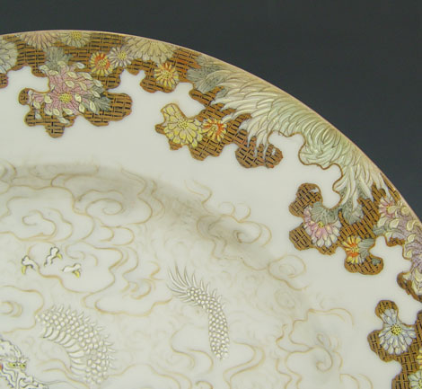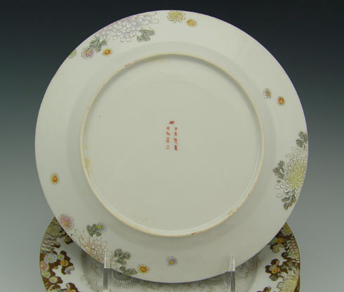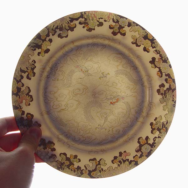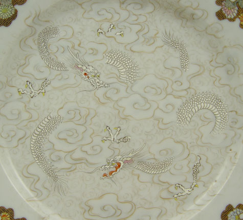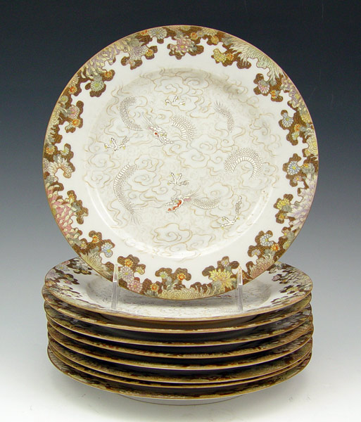 SET OF 9 MORIAGE DECORATED EGG SHELL PORCELAIN PLATES: Hand painted unusual basket and floral design border centering a white moriage dragon. Red characters verso. 8 1/4'' dia.