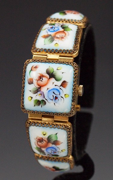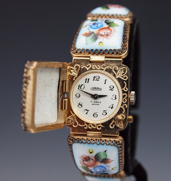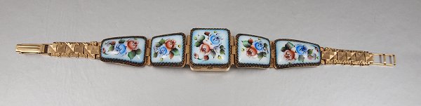 SWISS PEEK A BOO ENAMELED WATCH: Cornavin Swiss manufactured 17 jewel watch. The band and watch are gold filled, front of watch and the band with hand painted enamel plaques. Original band to watch. In running order. 7'' length.