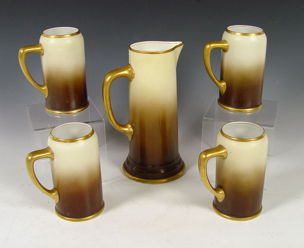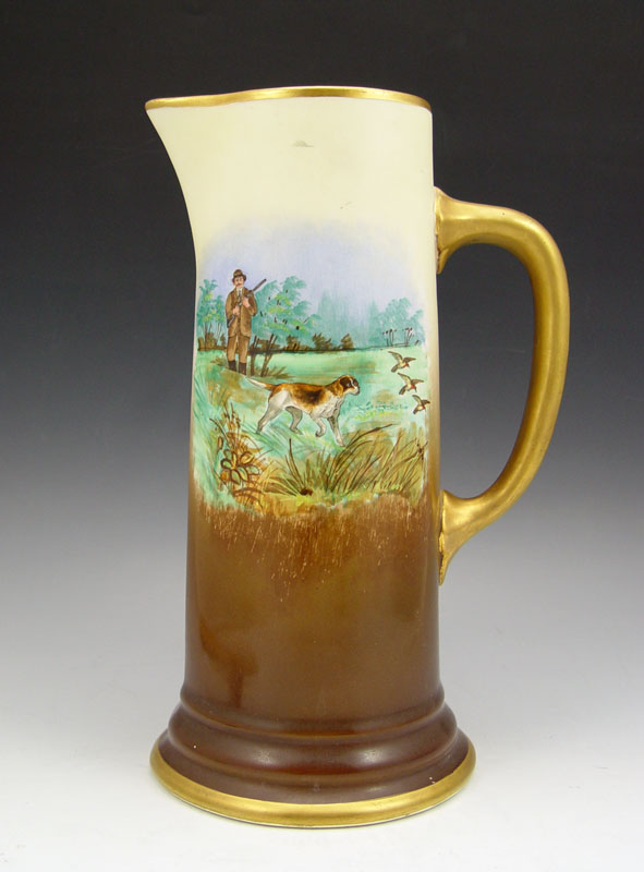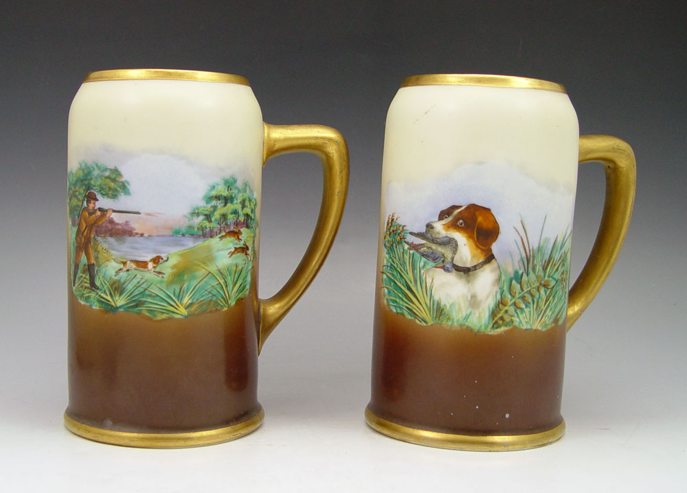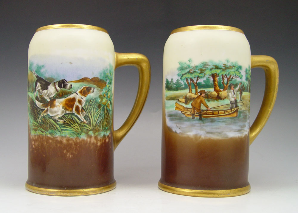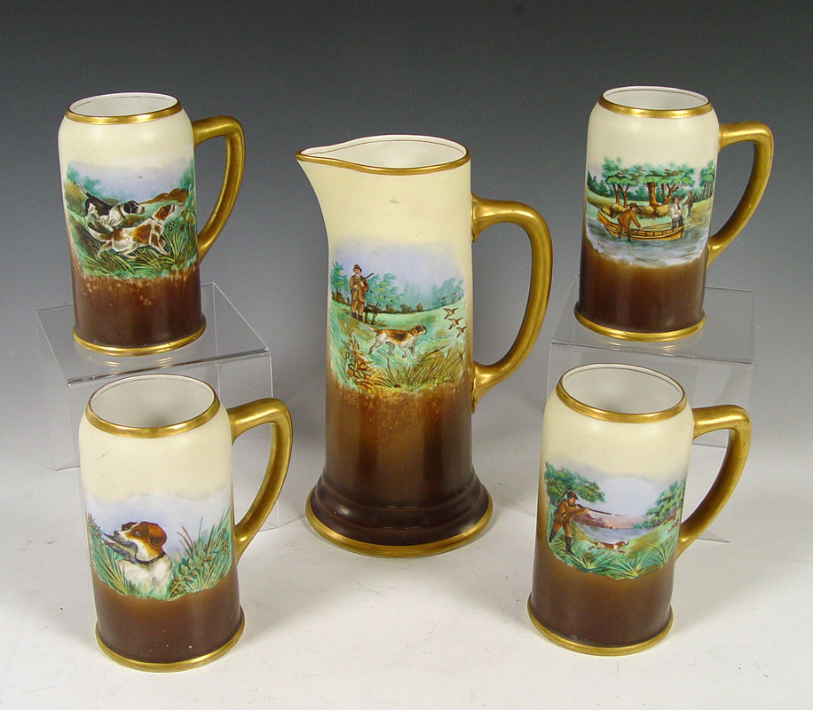 FRENCH LIMOGES SPORTING SCENE TANKARD AND MUGS: Tresseman & Vogt, early 19th C, each showing a different image. Tankard is 12'' tall, the mugs are 7''.