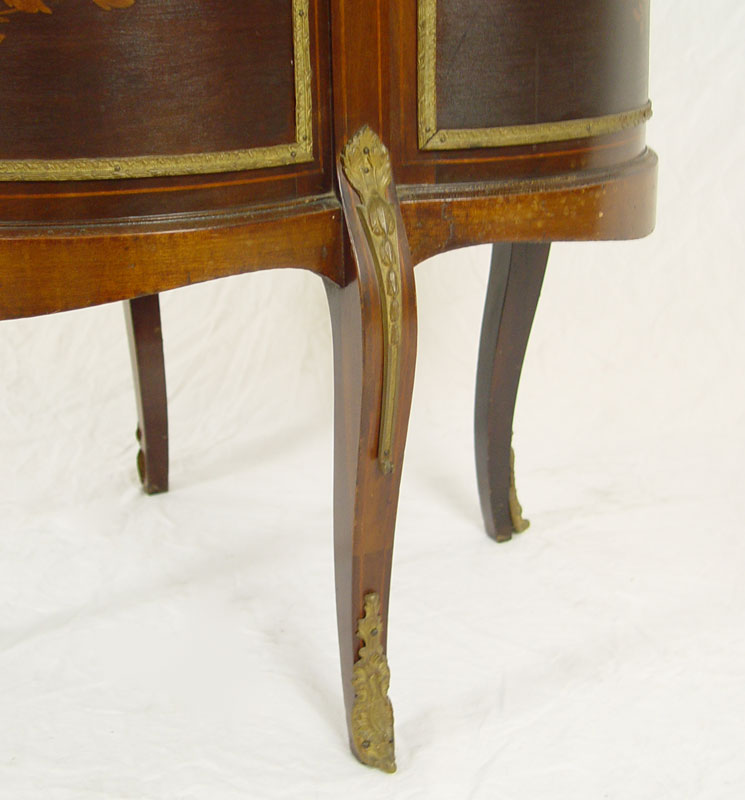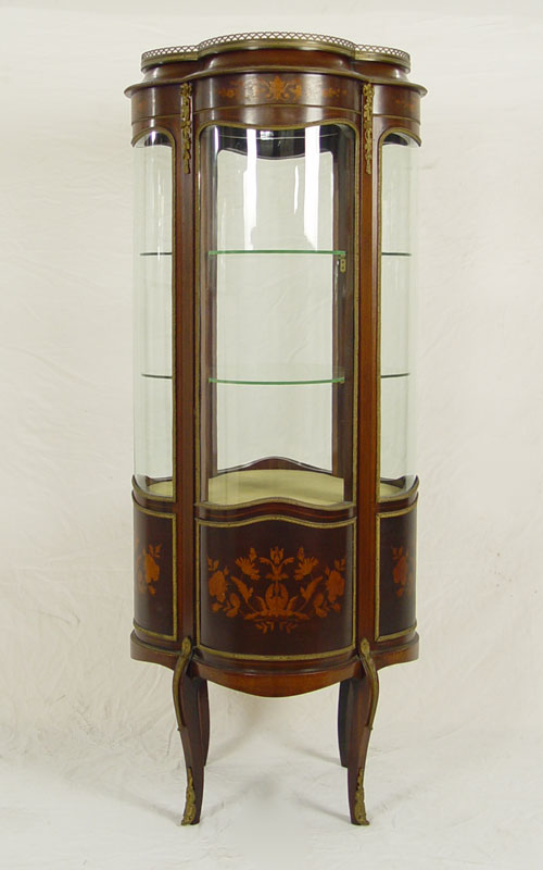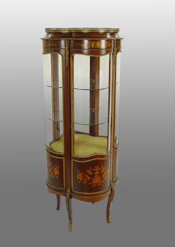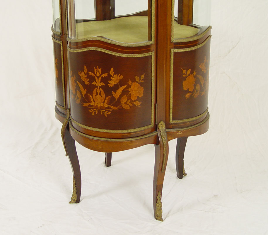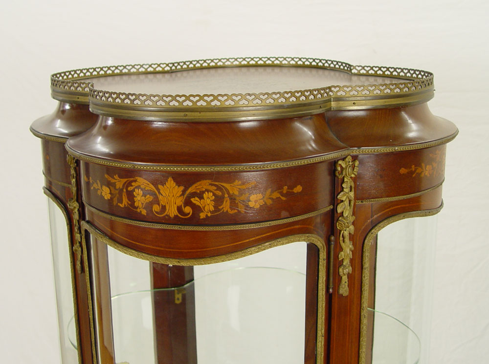 EARLY 20TH C FRENCH MARQUETRY INLAY VITRINE: Ormolu mounted curio display cabinet in a quatrefoil shape having 4 lobed glass panels, pierced gallery, shaped glass shelves. The key is available in the office. Approx. 59''h. x 24''w.